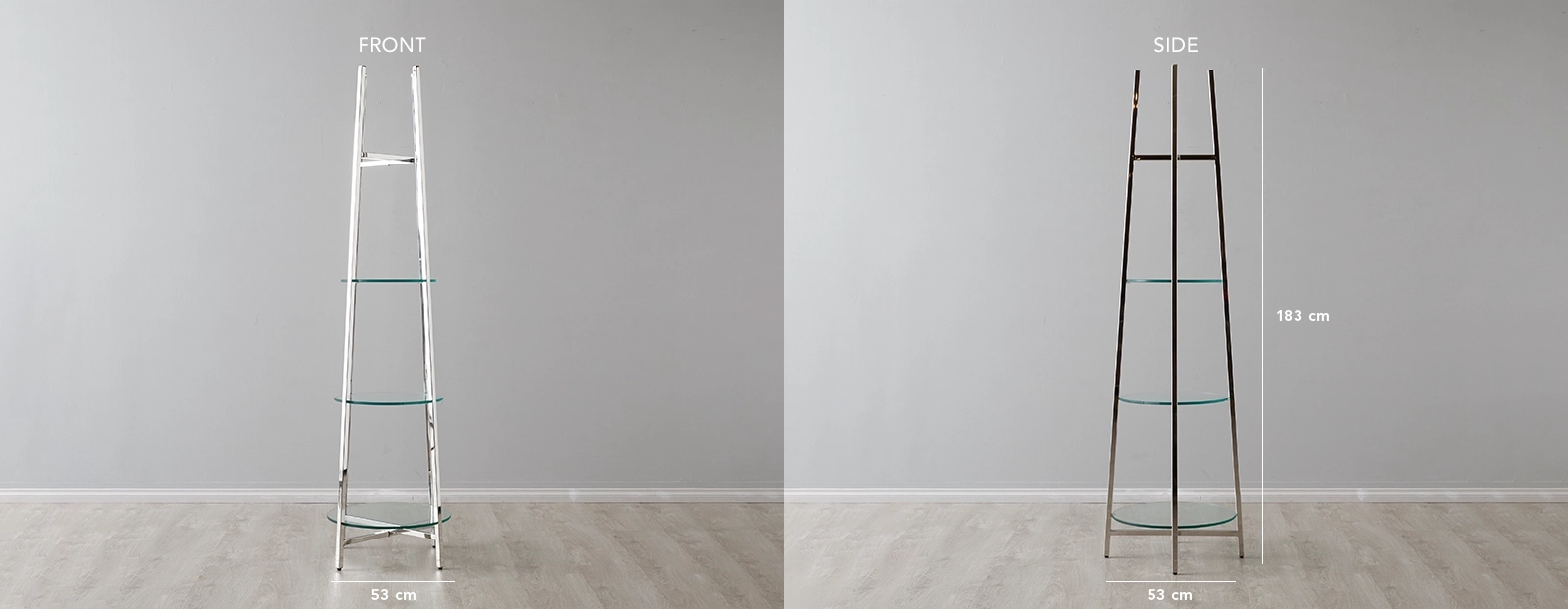 The display area consists of three circular glass shelves, perfect for showcasing trophies, mementos, or keepsakes. Pair it with one of our floor lamps to enhance and highlight your collection.