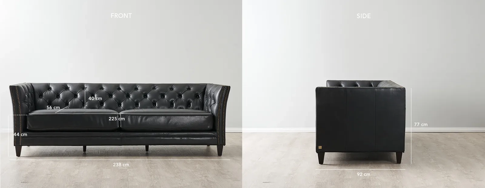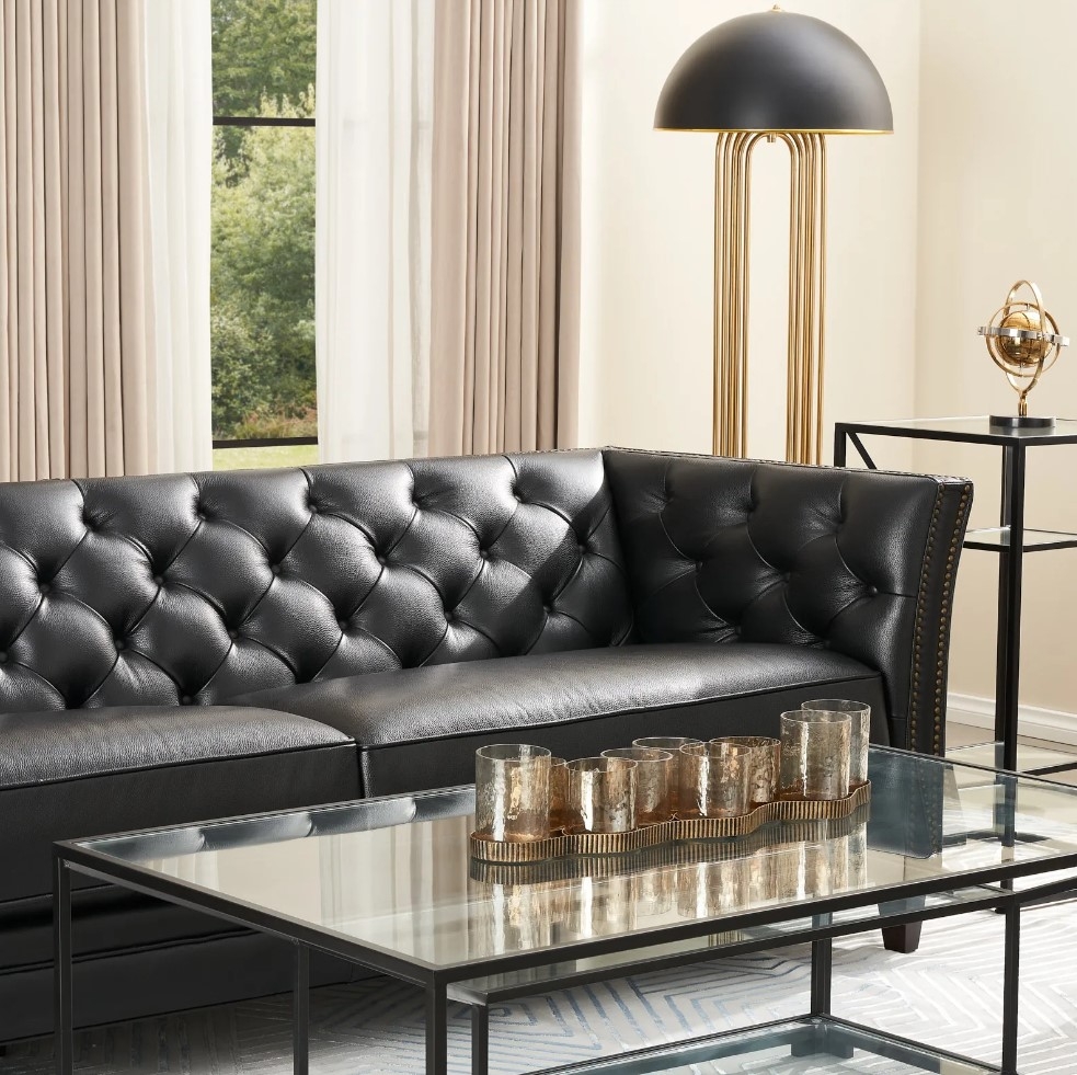 The Russell 3-Seater Sofa exudes timeless elegance with its classic tuxedo design, wrapped in black leather. This piece beautifully embodies classic sophistication, making it a luxurious centerpiece for any living room.