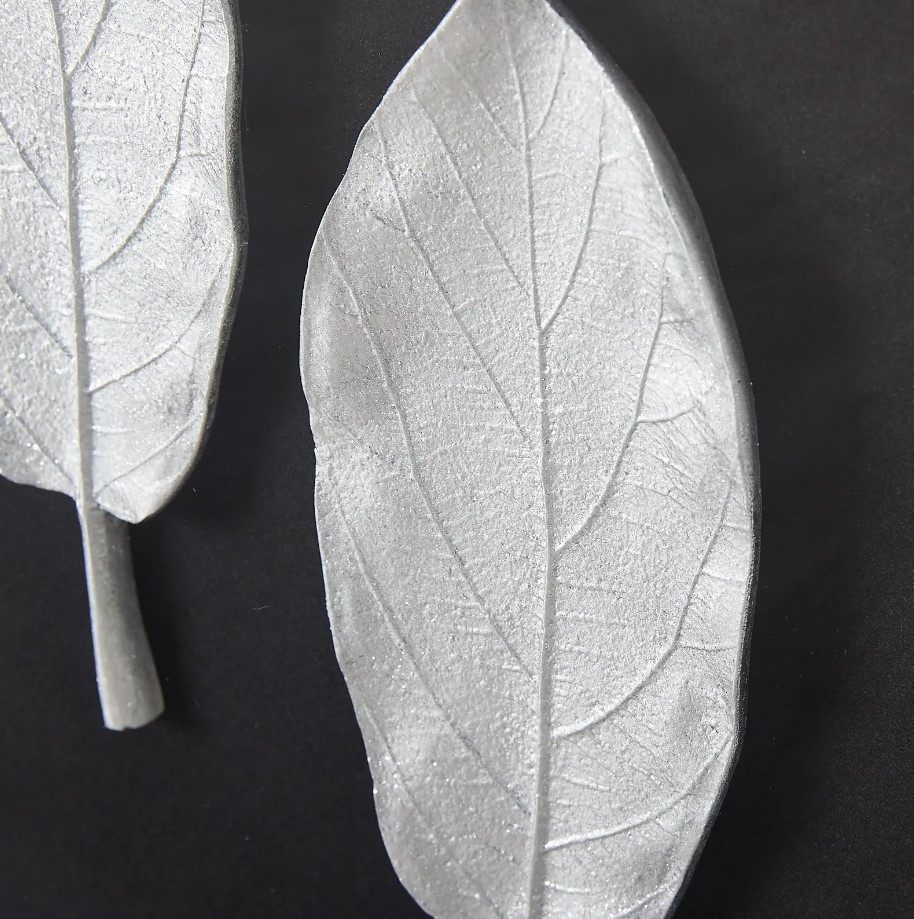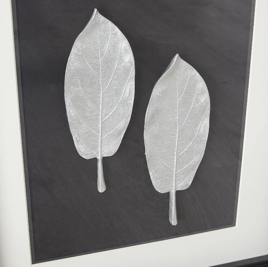 Center stage, two meticulously detailed silver Sallow leaves glisten, their intricate textures and contours magnified by the contrasting dark surroundings. The entire ensemble is encased in a sleek black frame, amplifying its contemporary and luxurious vibe.