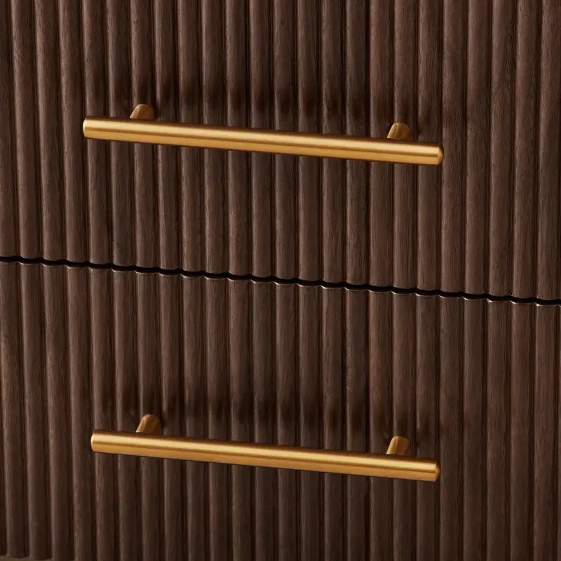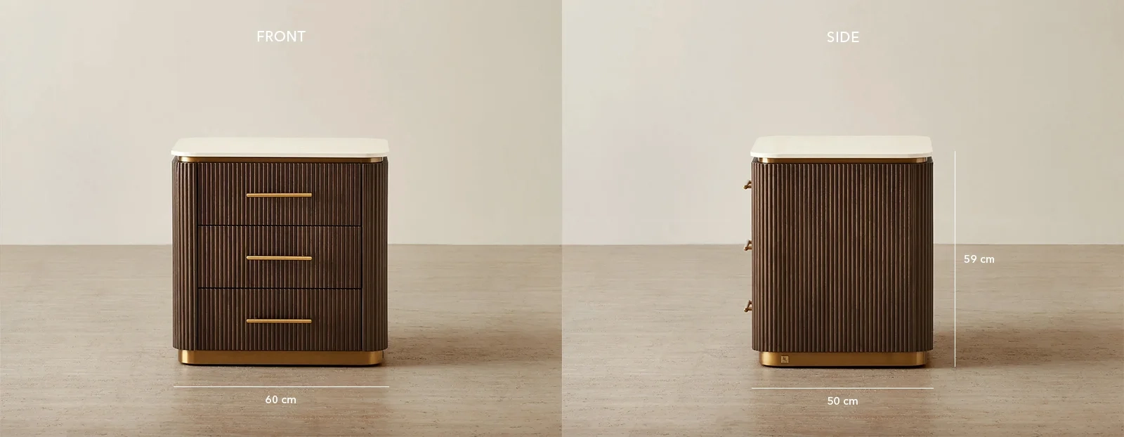 Crafted with an ebony brown ash veneer body, this bedside table showcases a rich, contemporary grain that brings depth and warmth to any bedroom. Featuring three spacious drawers with minimalist gold handles, it combines everyday functionality with elegant, modern design.