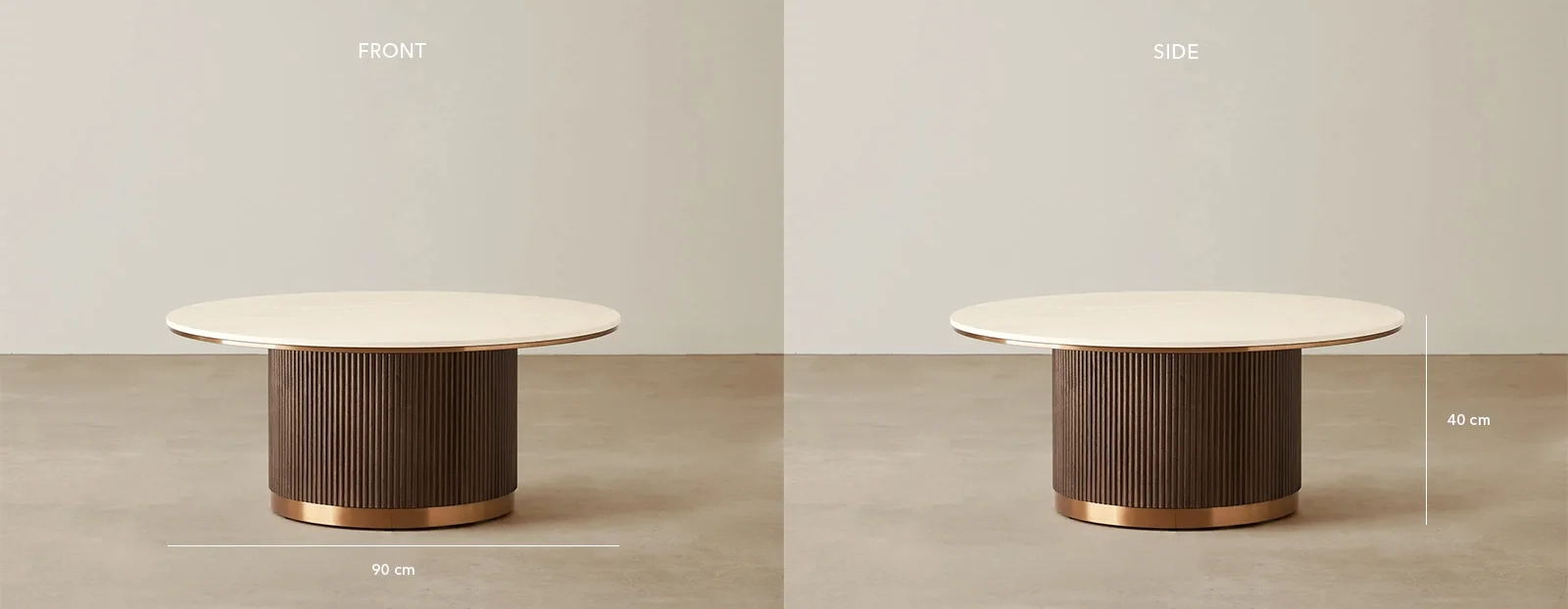 Its rounded design brings a sense of flow and unity to the living room. The rich ebony brown ash veneer base, accentuated by vertical reeding, perfectly complements its grandiose tabletop.
