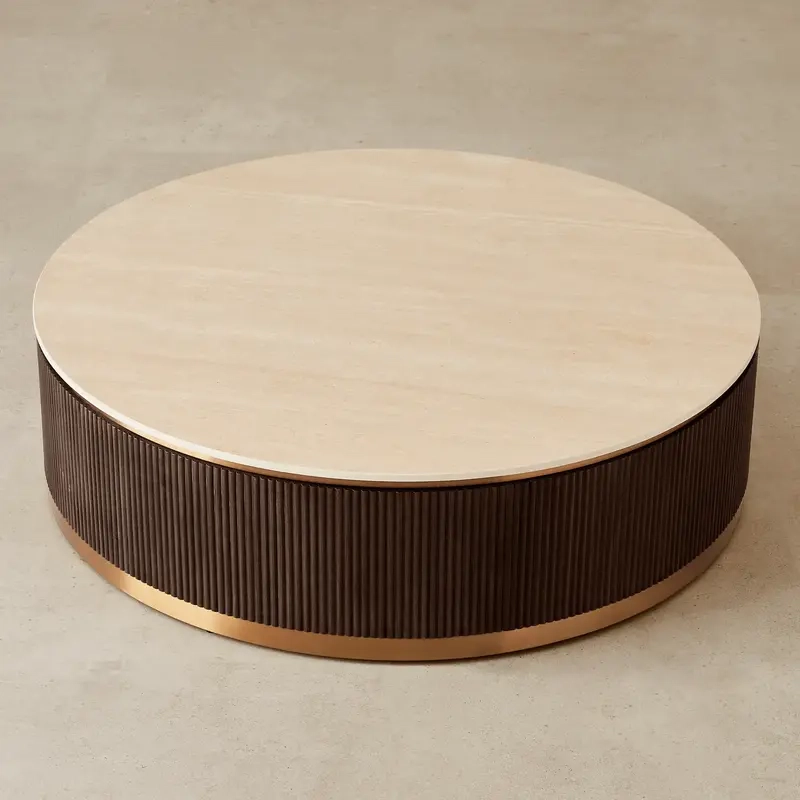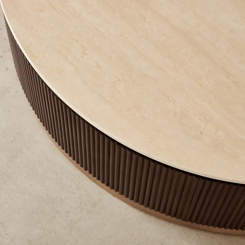 The San Pierre Ebony Brown Ash Veneer Coffee Table Low combines modern aesthetics with timeless elegance, featuring a round sintered stone tabletop in a travertine finish. Its rounded design adds a sense of flow and harmony to the living room.