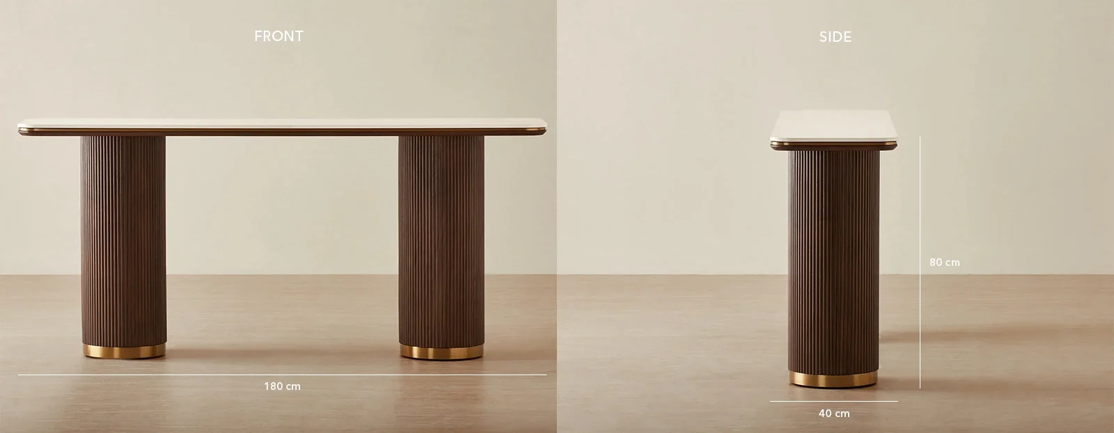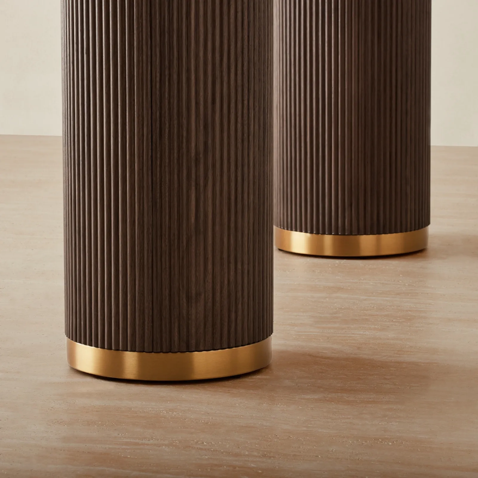 Its ebony brown ash veneer columns, adorned with vertical reeding, add depth and sophistication, making the piece a true statement. The golden accents on the base and edges highlight the table’s refined aesthetic.
