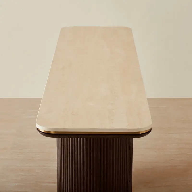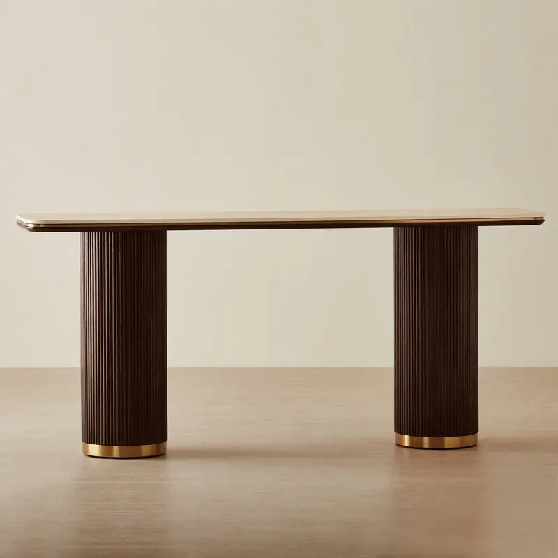 Its ebony brown ash veneer columns, enhanced with vertical reeding, add depth and sophistication, making it a striking piece. Golden accents on the base and edges elevate the table’s refined aesthetic, perfect for contemporary interiors.
