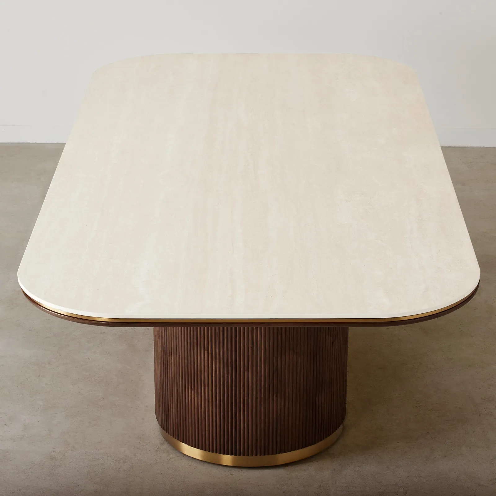 The San Pierre Dining Table stands as a testament to grandeur and sophistication, crowned with a majestic cream travertine finish sintered stone top.