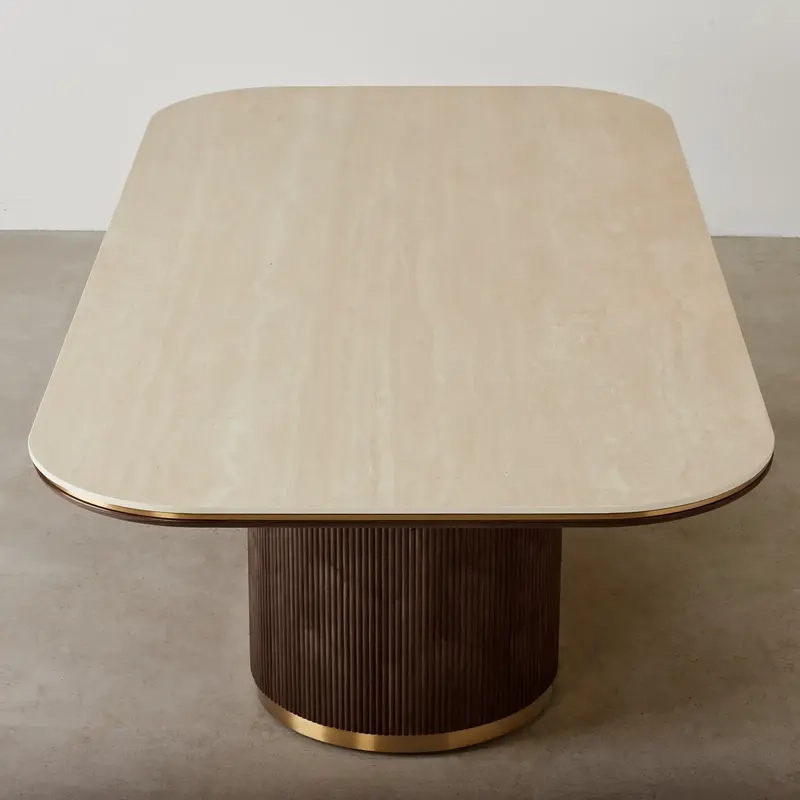 Anchored by a single stately column leg with intricate vertical reeding, it offers a striking focal point for your dining space. With a spacious 240x120cm surface, it perfectly balances style and functionality for hosting memorable gatherings.
