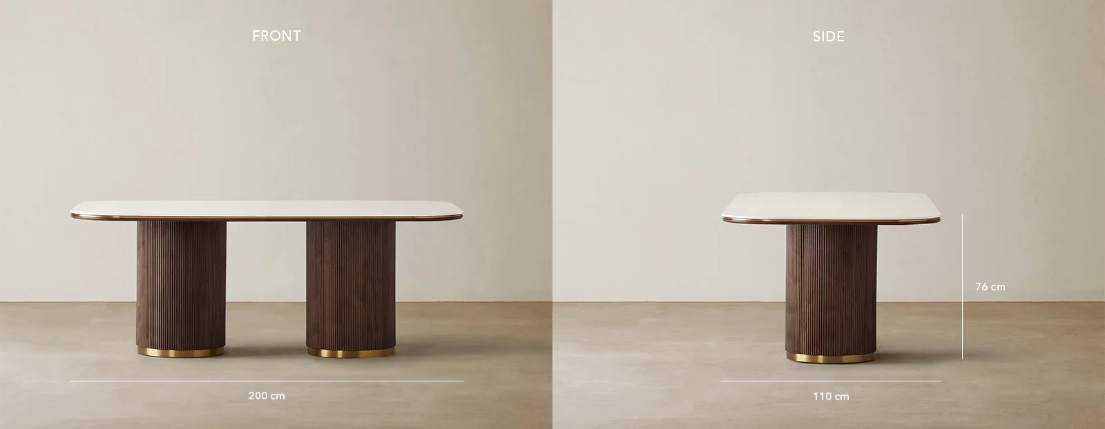 The rich ebony brown ash veneer is complemented by the table's stately design, anchored by two elegant legs with intricate vertical reeding. This 200x110cm dining table blends modern luxury with classic appeal.
