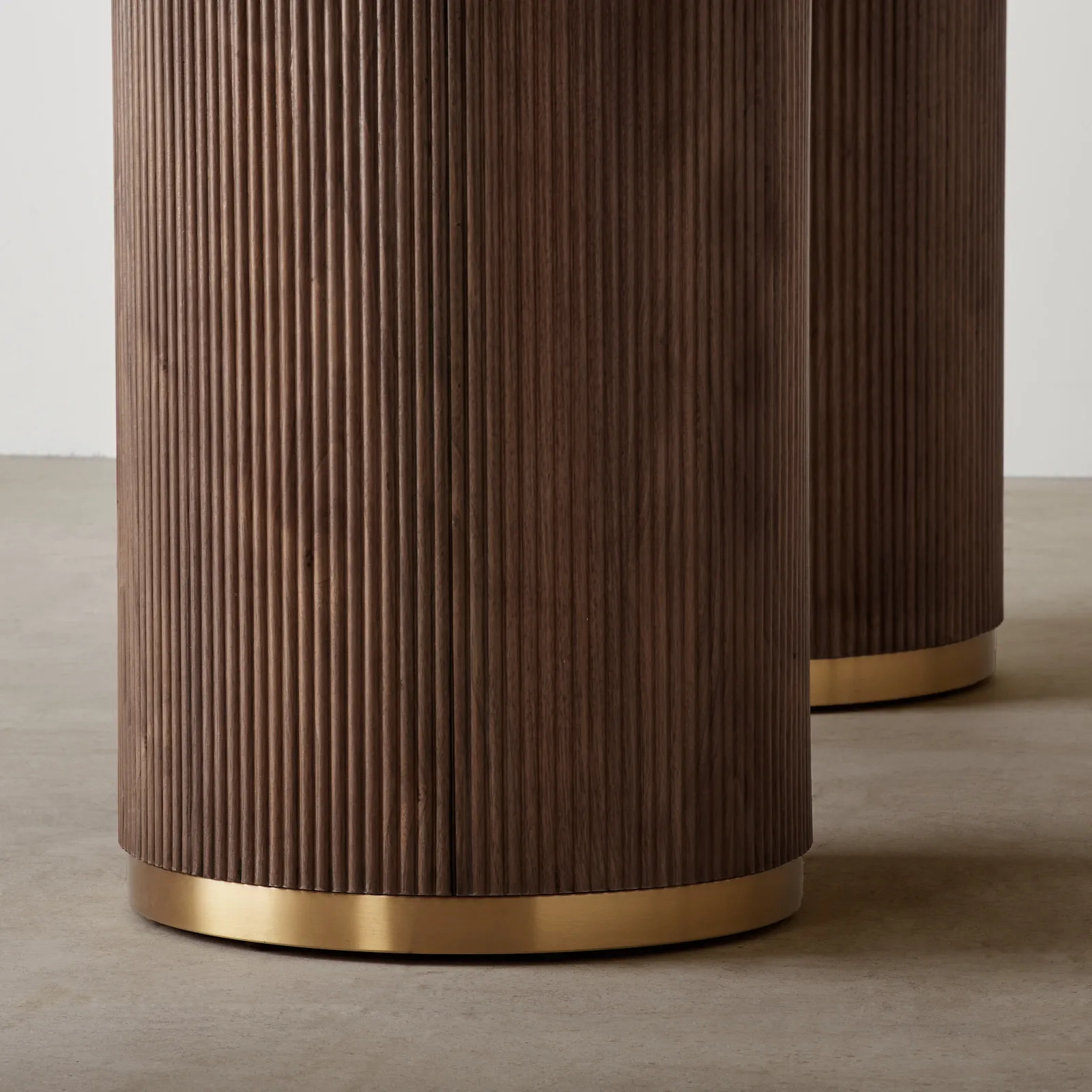The rich ebony brown ash veneer is complemented by the table's stately design, anchored by two elegant legs with intricate vertical reeding.