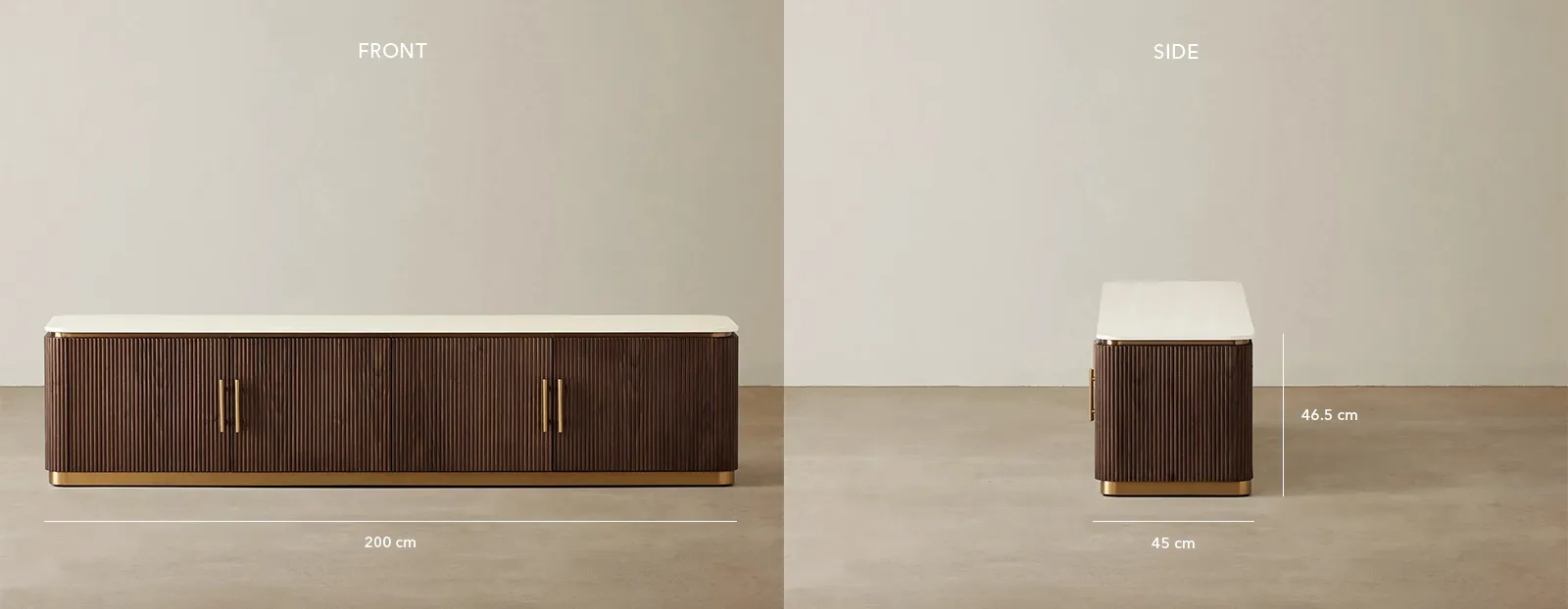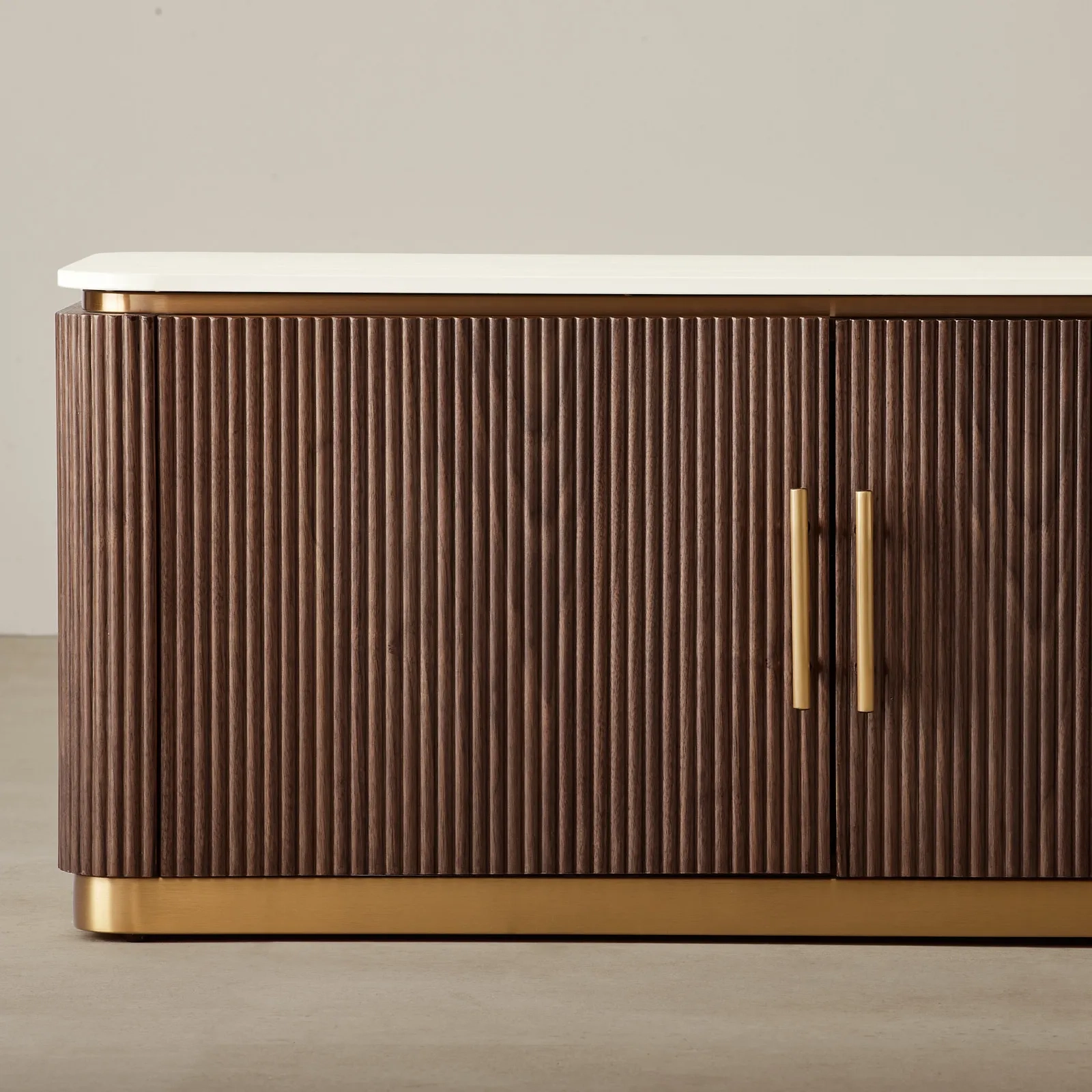 The ebony brown ash veneer exterior with a fluted design adds visual appeal. The unit offers spacious cabinets for multiple devices and built-in wire holes for easy cable management.