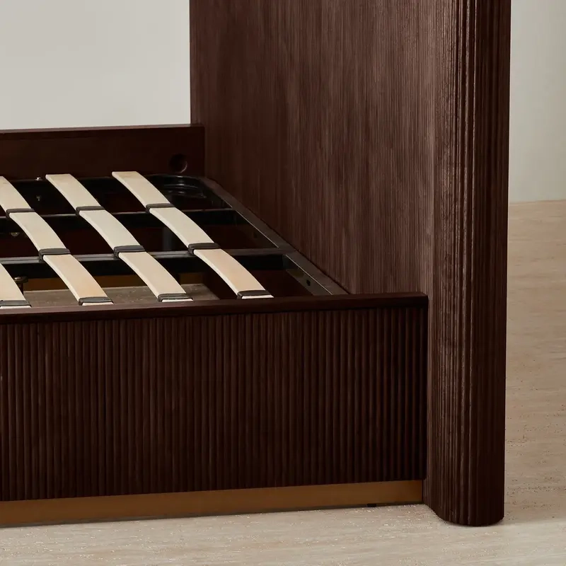 The San Pierre Bed showcases an ebony veneer finish that enhances its modern design. Its fluted detailing adds texture and depth, making it a standout feature in any bedroom.