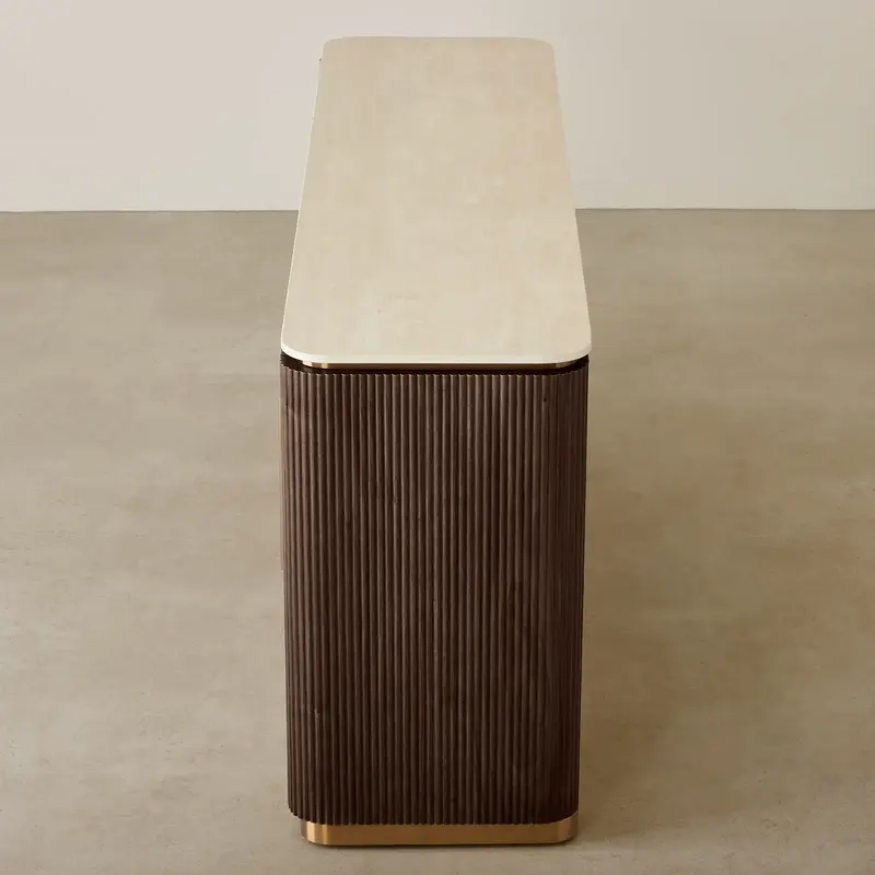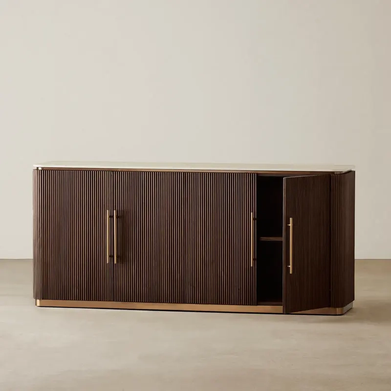 Its deep Dark Brown Ash Veneer, enhanced by its fluted design. Spacious cabinets provide practical storage, combining functionality with a sense of refined grandeur.