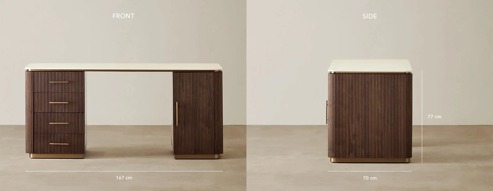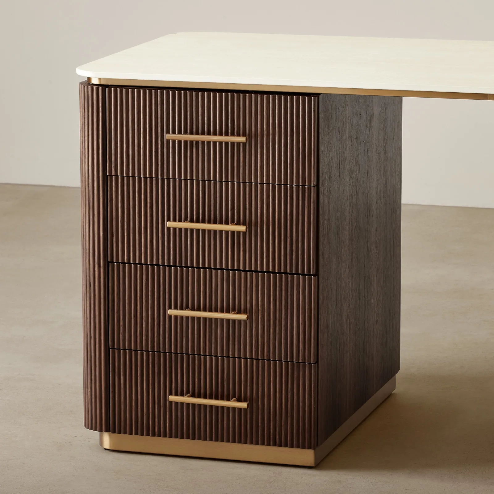 The San Pierre Ebony Brown Ash Veneer Study Desk features a luxurious sintered stone top with a cream travertine finish, perfect for work or study. Its rich ebony brown ash veneer with a fluted design adds timeless elegance.