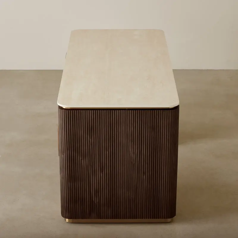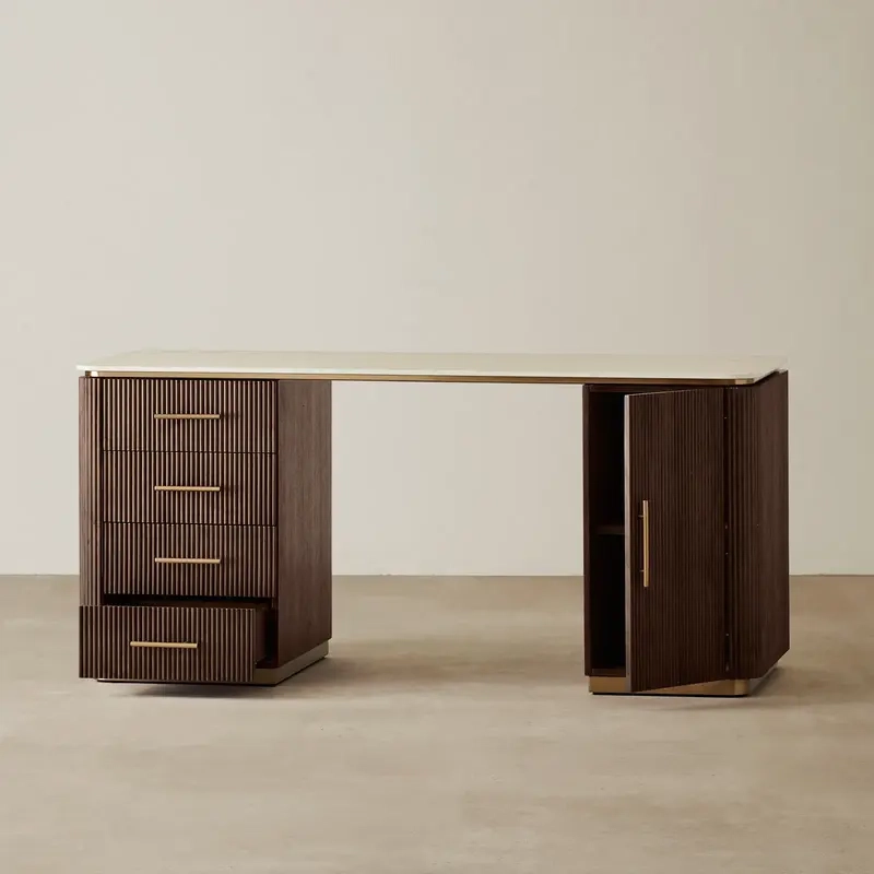 The San Pierre Study Desk showcases a luxurious sintered stone top with a travertine finish, ideal for work or study. Its Ebony Brown Ash Veneer with a fluted design adds sophistication and timeless style.