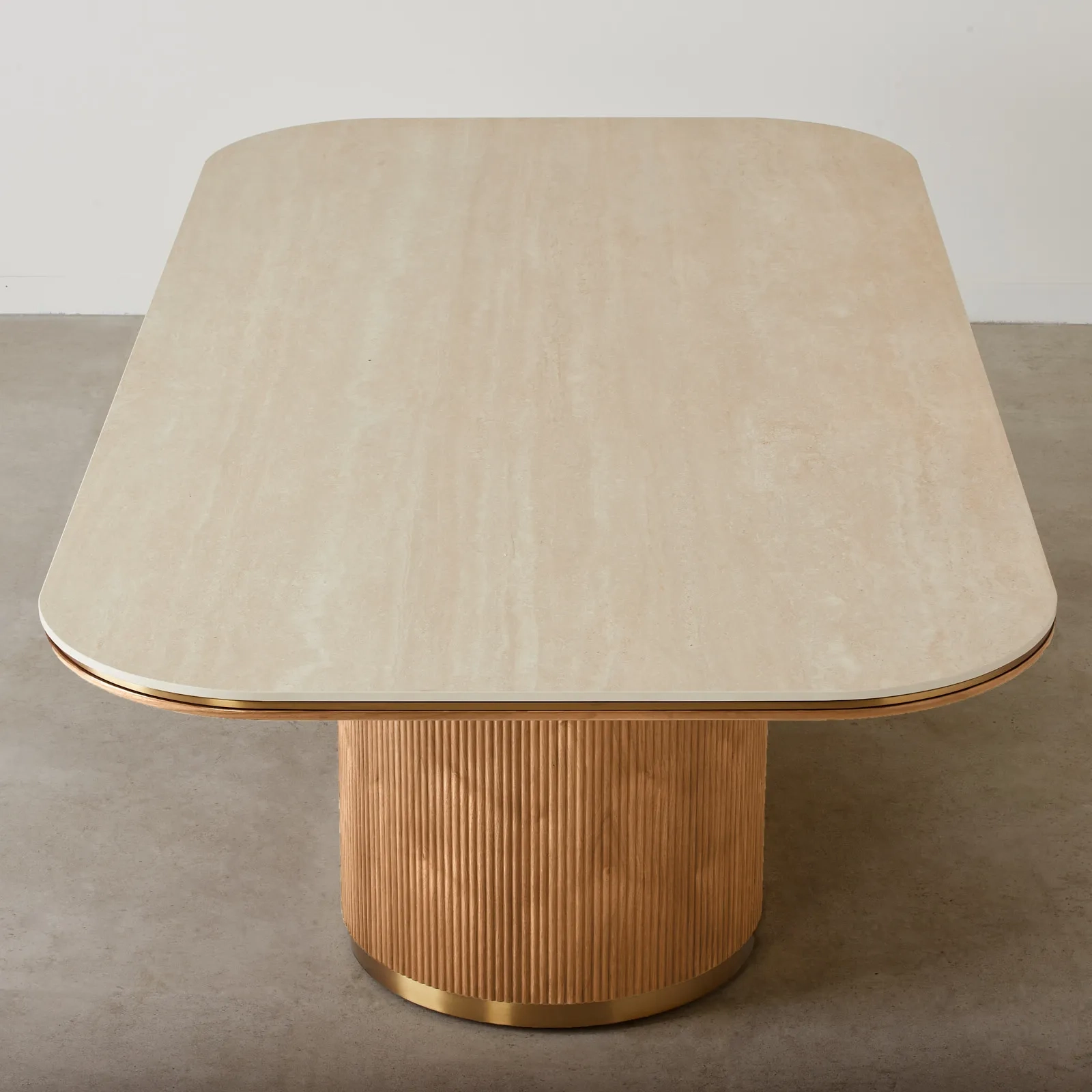 The San Pierre Dining Table stands as a testament to grandeur and sophistication, crowned with a majestic travertine finish sintered stone top. This exquisite surface, renowned for its timeless beauty, transforms everyday dining.