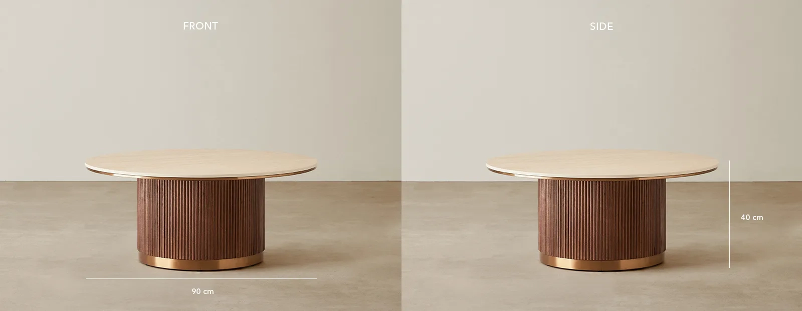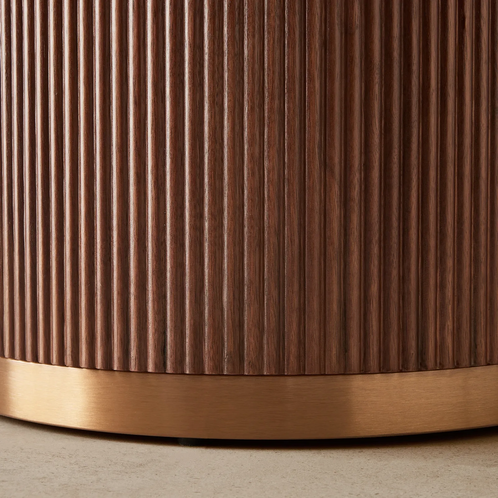 Its rounded design brings a sense of flow and unity to the living room. The warm hue of the walnut veneer base, accentuated by vertical reeding, perfectly complements its grandiose tabletop.