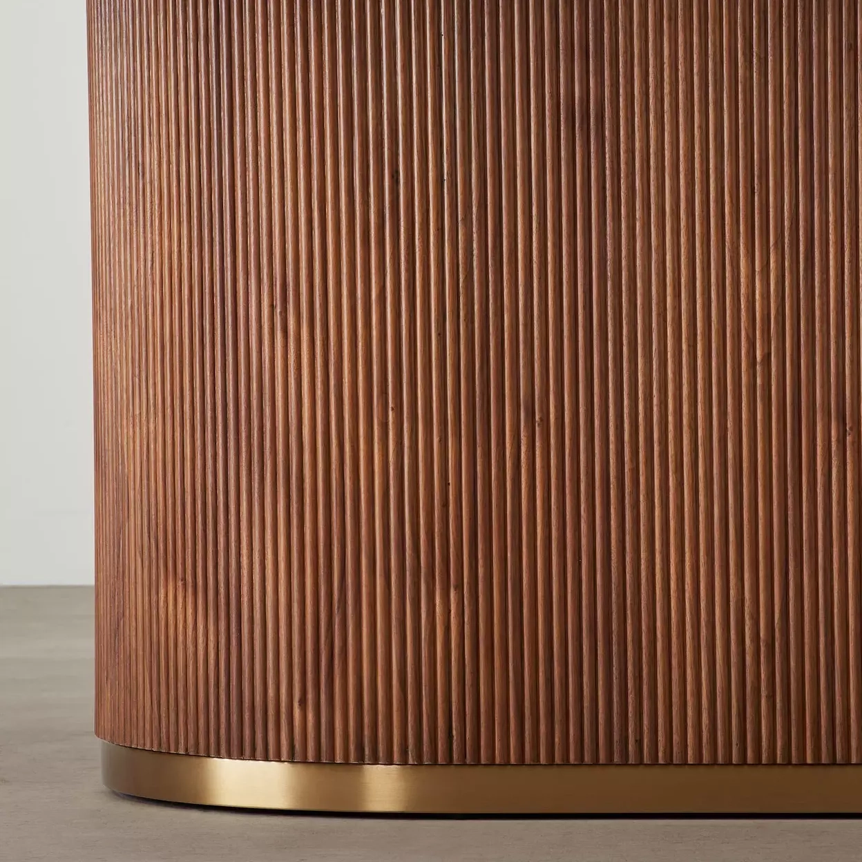 The opulent golden outline gracefully frames the table and its column, adding a regal touch that complements the rich walnut veneer. Anchored by a stately column leg with intricate vertical reeding.