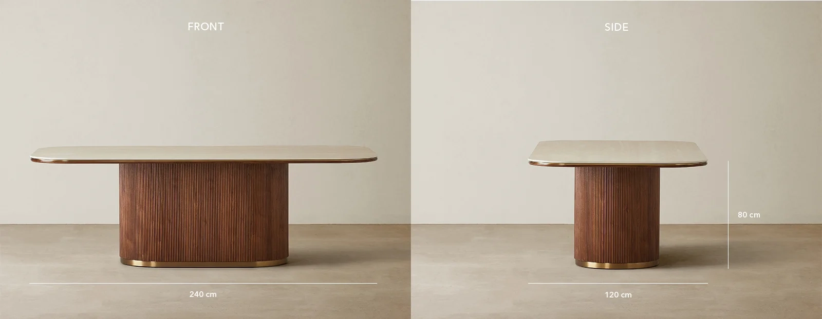 San Pierre Walnut Veneer Dining Table - Single Leg - Travertine Finish Sintered Stone Top 240x120cm