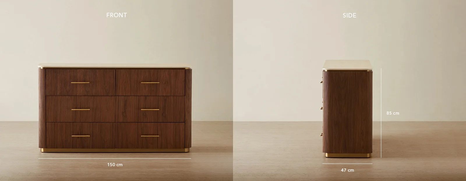 Its walnut veneer features vertical reeding, adding a gentle rhythm and texture. With roomy drawers, it’s perfect for storing everything from cozy sweaters to keepsakes.
