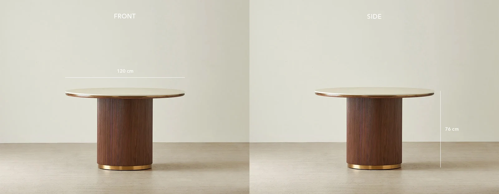 A brushed brass trim encircles the base, lending a polished, high-end accent. At 120cm, it offers ample space for refined dining and memorable gatherings. The round profile comfortably accommodates up to five people.