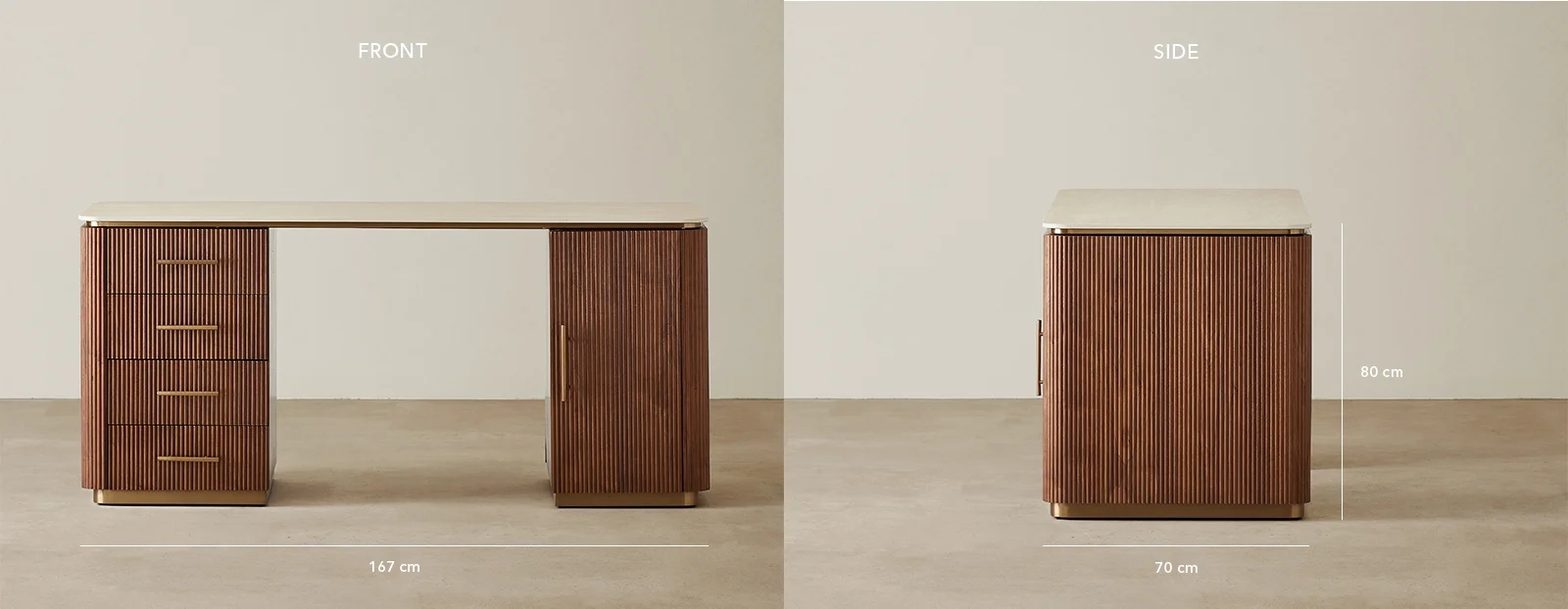 The San Pierre Study Desk features a luxurious sintered stone top with a travertine finish, perfect for work or study. Its warm walnut Veneer with a fluted design adds timeless elegance.