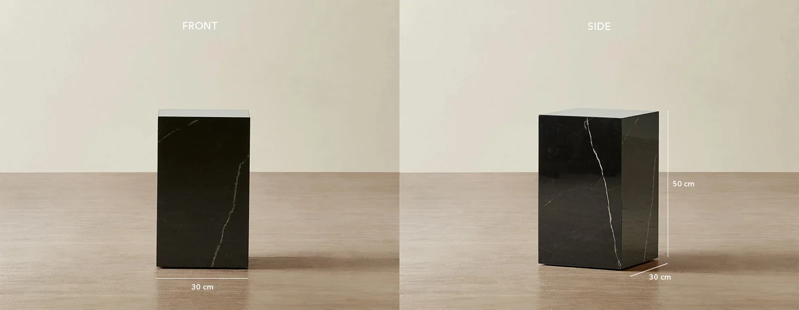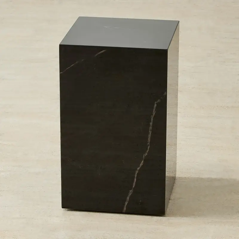 The Santorini Plinth showcases a bold rectangular form in glossy nero-black sintered stone.