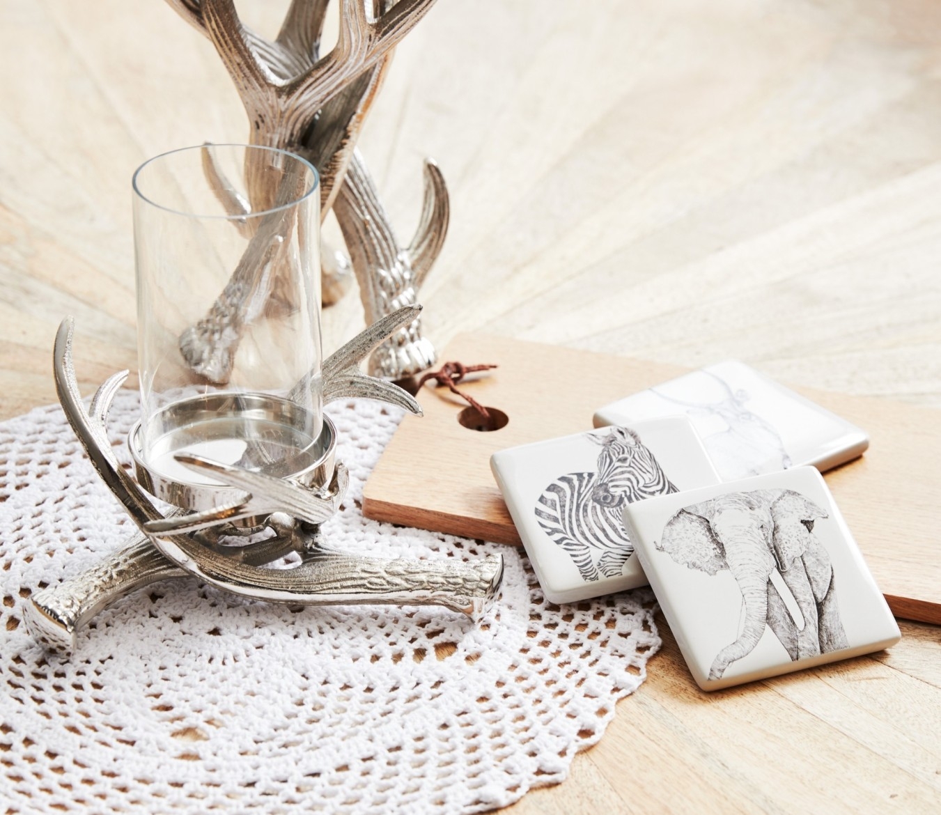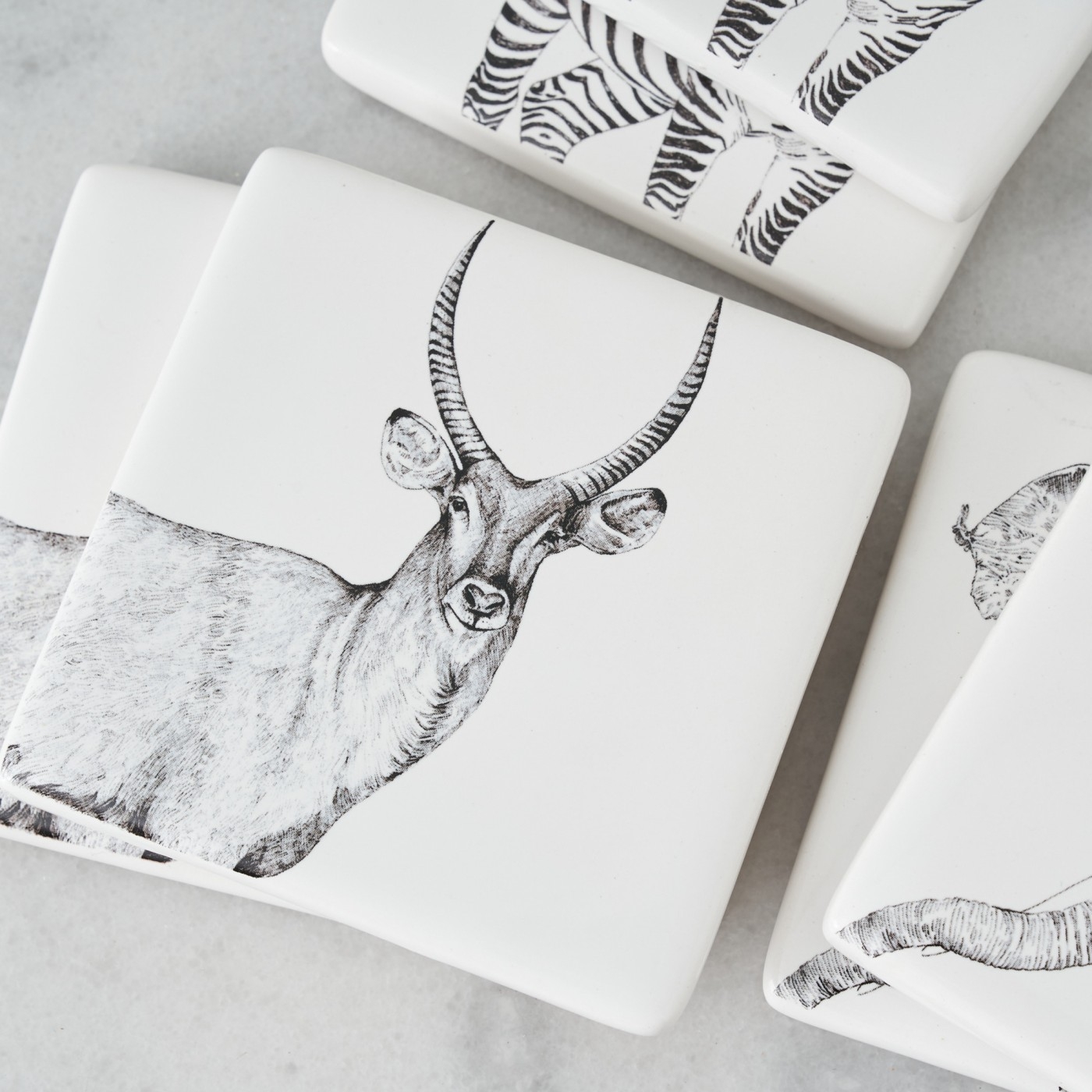 Their pristine white base serves as the perfect canvas, accentuating the exquisite imprints of majestic animals. Each coaster is square-shaped, a design choice that not only enhances its modern aesthetic but also provides ample space for your drinkware.