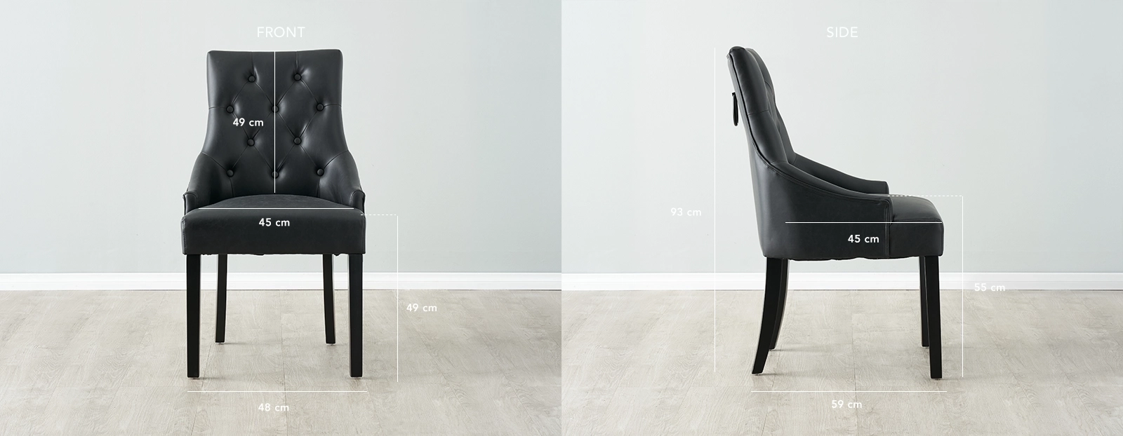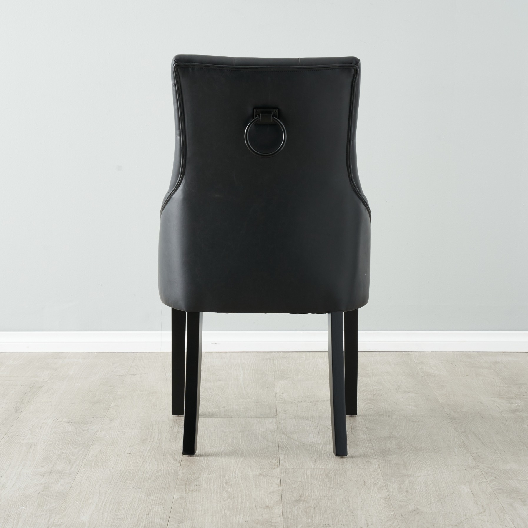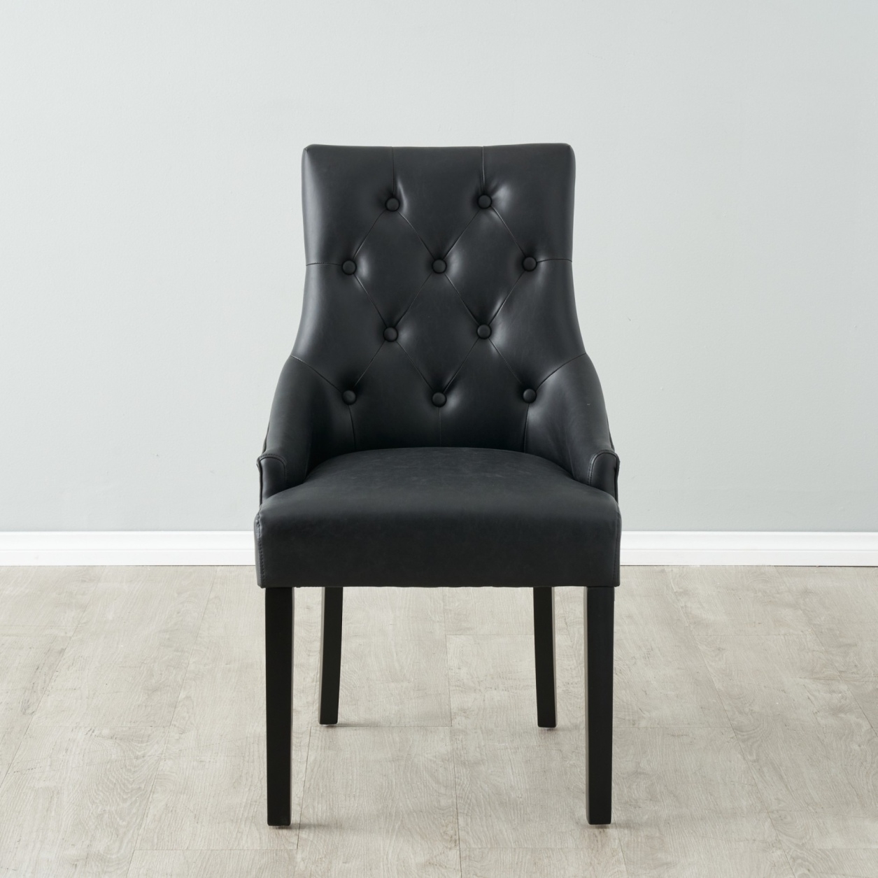 Elevate your dining experience with the timeless sophistication of the Saxon Black Vegan Leather Dining Chair. This chair seamlessly blends modern craftsmanship with vintage design elements, creating a perfect balance of comfort and style for your dining area. Its classically shaped frame is adorned with premium quality vegan leather in a sleek black hue, exuding an air of elegance and refinement. Buttoned tufts adorn the Saxon's exquisite backrest in a striking diamond motif.