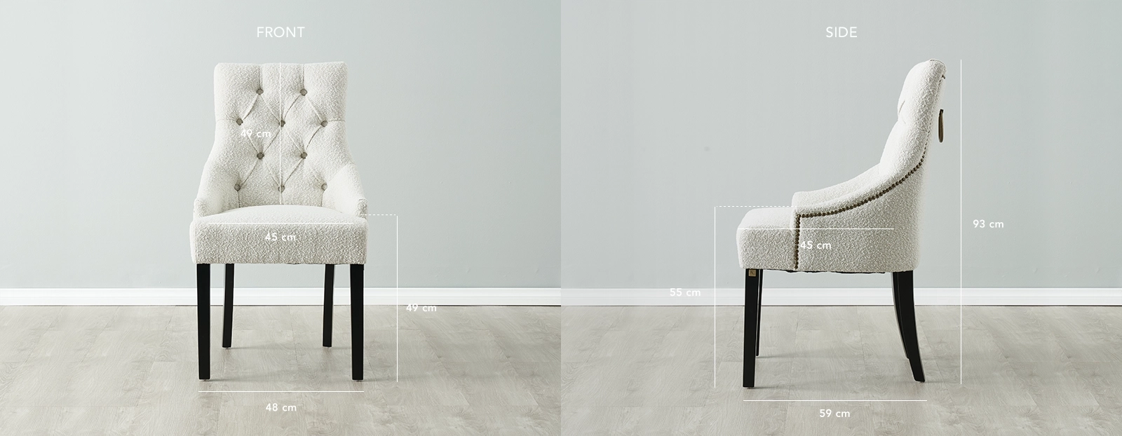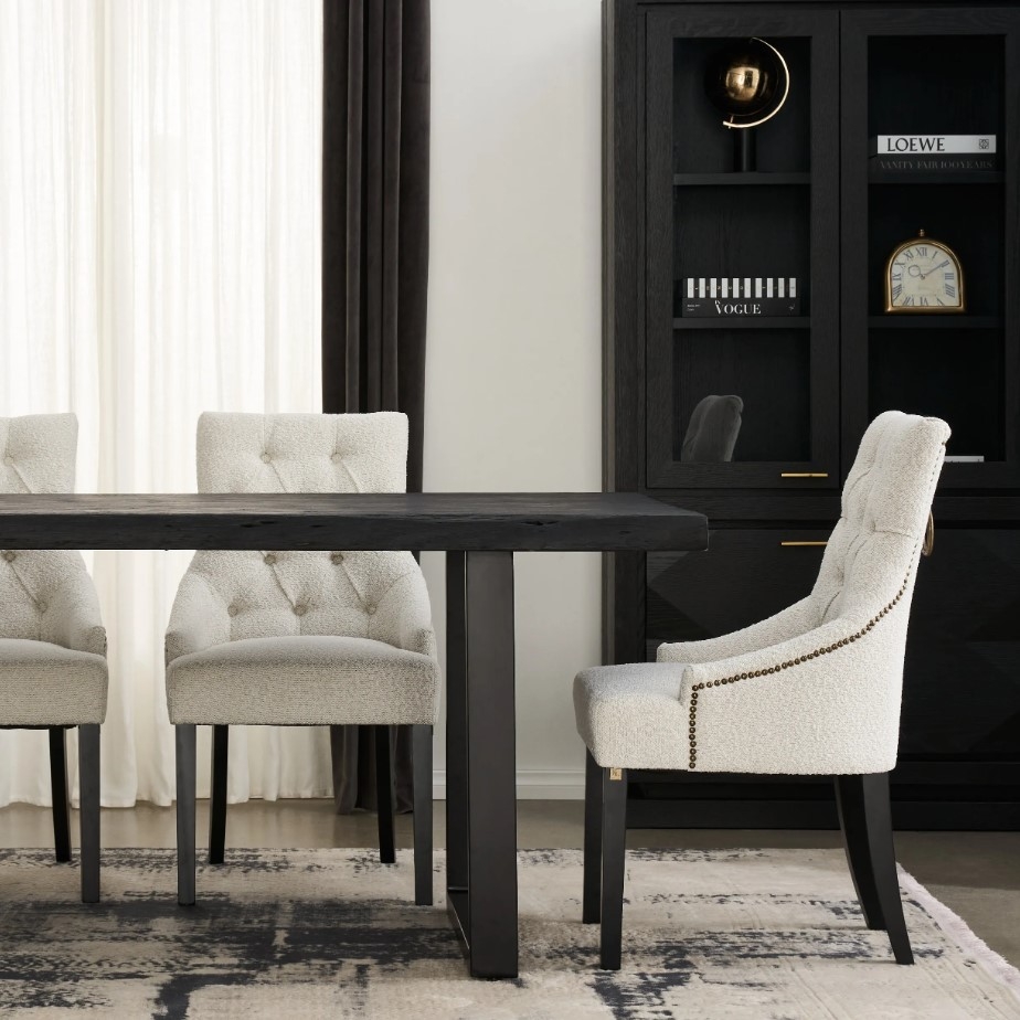 The combination of the textured boucle fabric, tufted backrest, and decorative studs creates a visual feast for the eyes. Not only does the Saxon prioritize style, but it also ensures your comfort with its dense foam padding. To further enhance its aesthetic appeal, a decorative pull ring adds a touch of refinement and serves as a delightful accent to the overall design of the chair. The Saxon works best when paired in even numbers, along with one of our majestic dining tables.