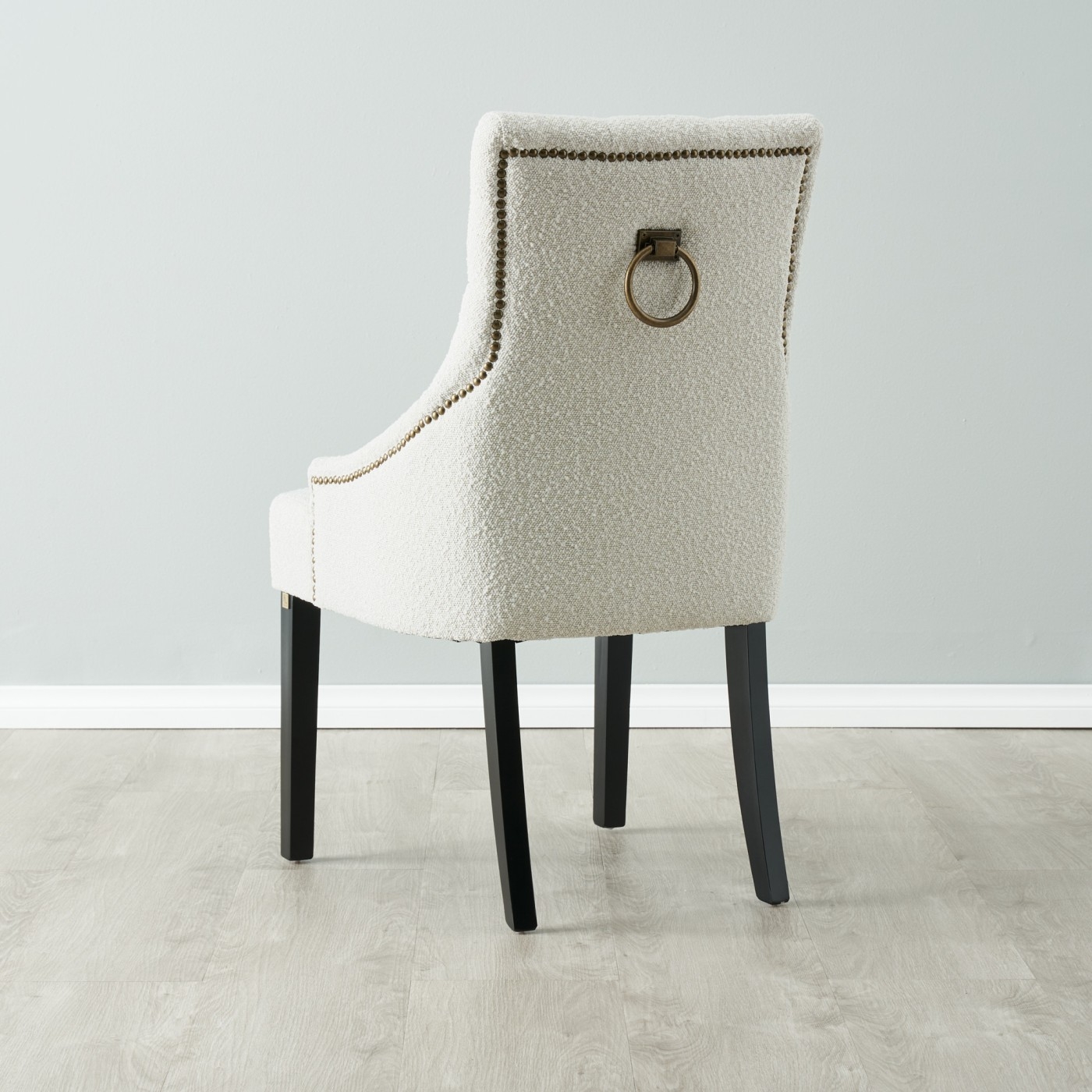 Indulge in the luxurious comfort and exquisite design of the Saxon Cream Boucle Dining Chair. Immerse yourself in the inviting and cozy aesthetic of this chair, offering a haven of relaxation and style. Sink into the plush and richly textured boucle fabric seat, providing a touch of lavishness to your dining experience. The Saxon's backrest is adorned with buttoned tufts in a captivating diamond motif, adding an elegant and sophisticated charm to the chair's design. Enhancing its allure is a row of beautiful brass-coloured studs that runs along its gorgeous outline.