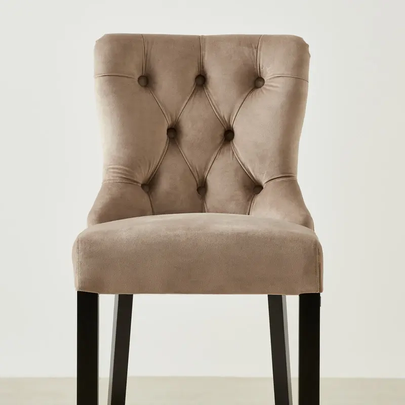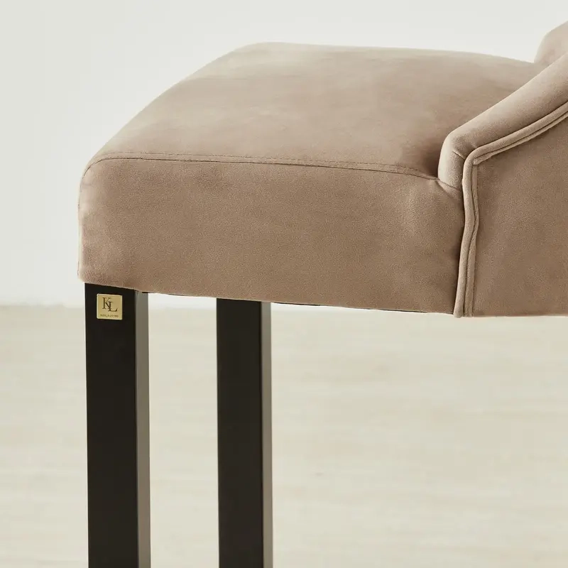 Enhance your bar area with the Saxon II Beige Velvet Bar Stool. Featuring a diamond-tufted backrest and a sleek pull ring, it brings a refined touch to any space.