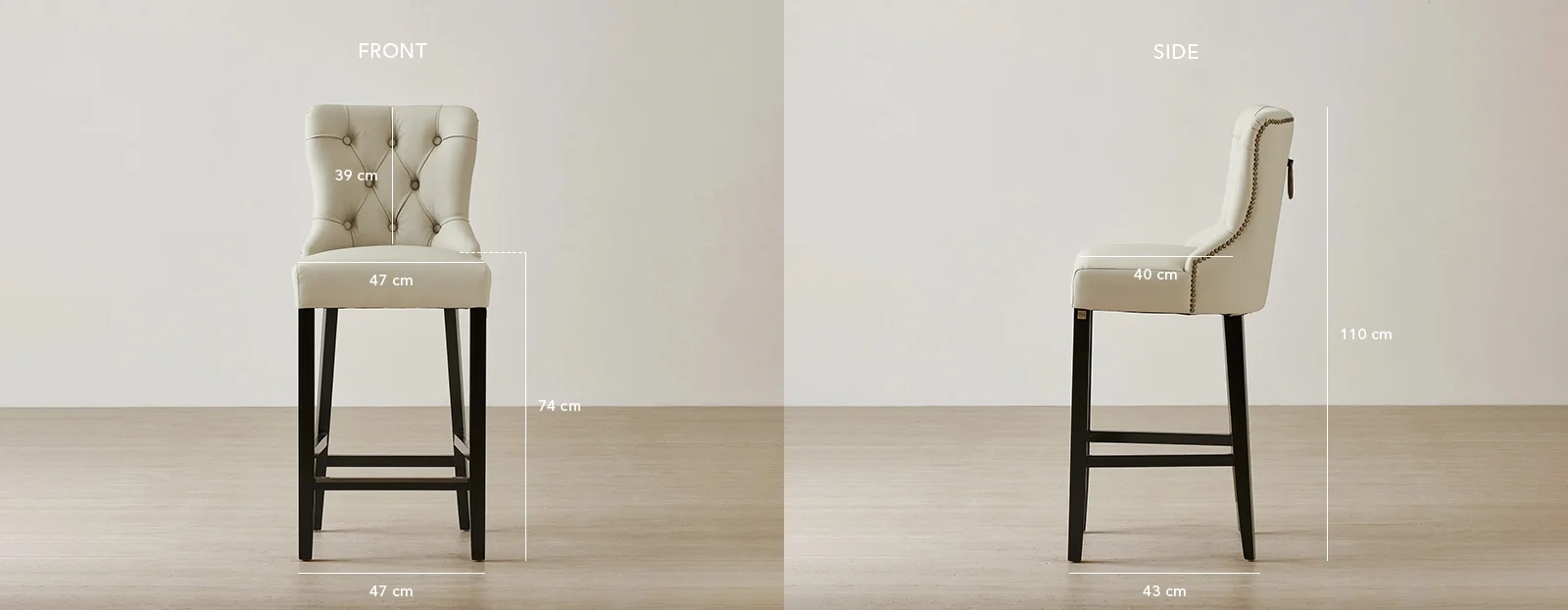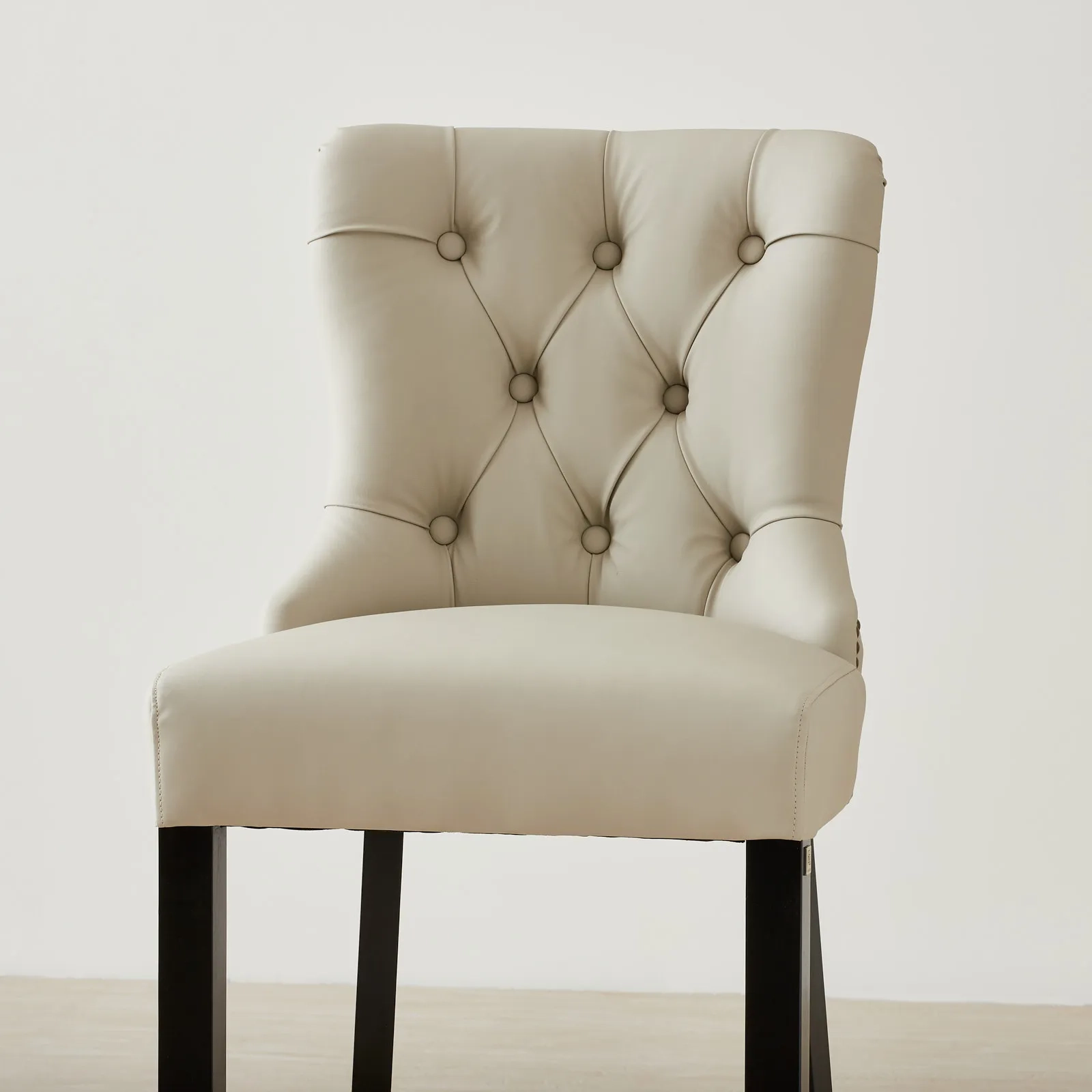 Introduce a touch of Cloud Grey to your bar area with the Saxon Vegan Leather Barstool. It features a diamond-tufted backrest and a sleek pull ring for timeless elegance.
