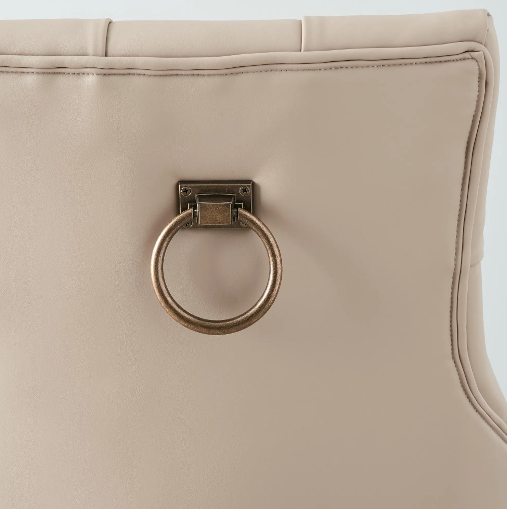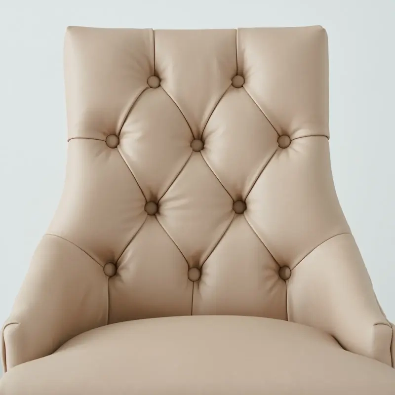 The Saxon Dining Chair blends modern craftsmanship with vintage charm, featuring premium sand beige vegan leather and a classically shaped frame.