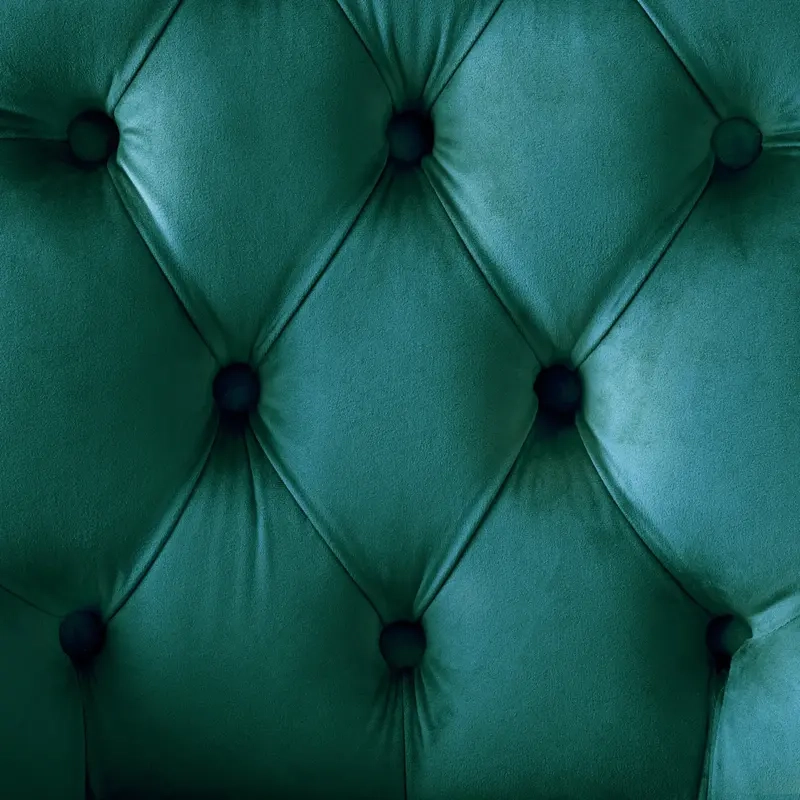 The Saxon Dining Chair brings a refined presence to any dining space. It features a button-tufted backrest, black tapered legs, and a subtle pull ring on the rear.