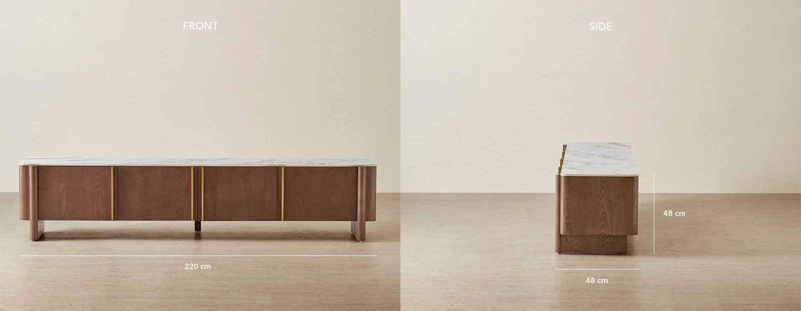 Brass-toned accents flow between each panel, adding a subtle rhythm while concealing generous compartments designed for media storage and cable management.