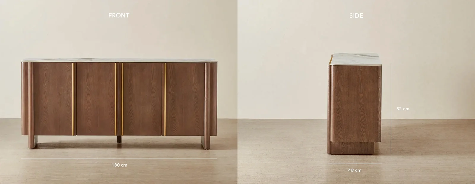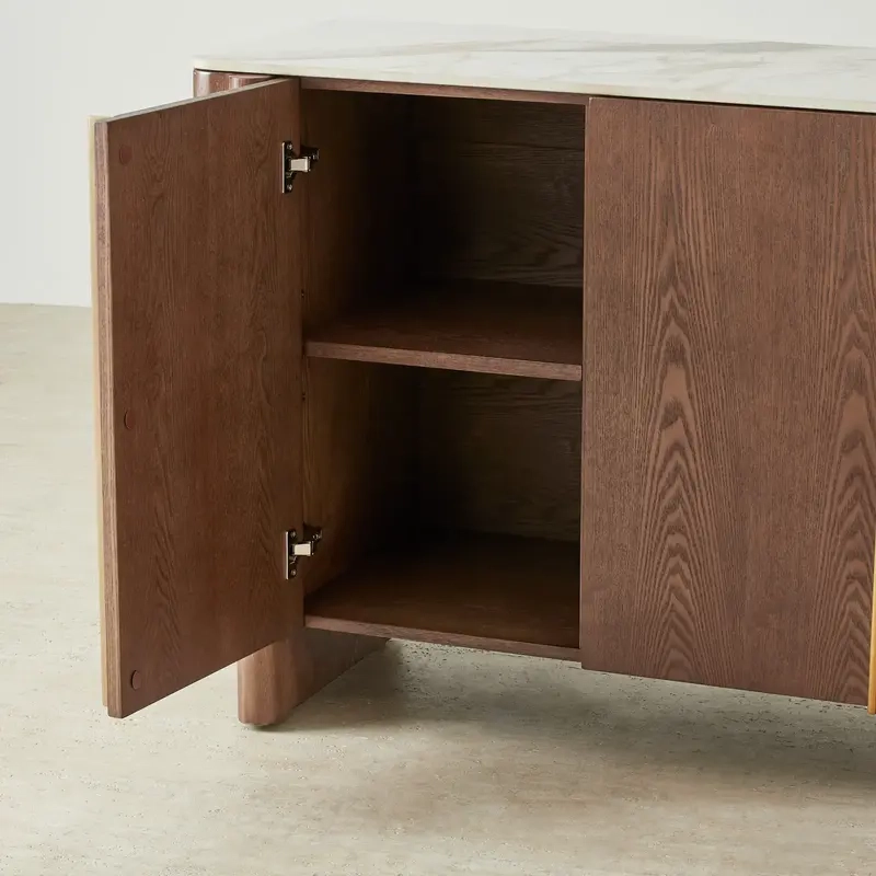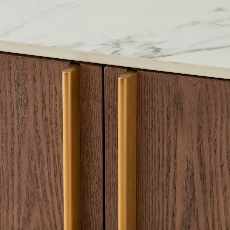 Crowned with a luxurious white sintered stone top, the Sir Lionell Sideboard offers a sophisticated surface that pairs lasting durability with modern elegance. Its sleek, elongated form rests on walnut brown wooden legs, giving it a warm, grounded presence.