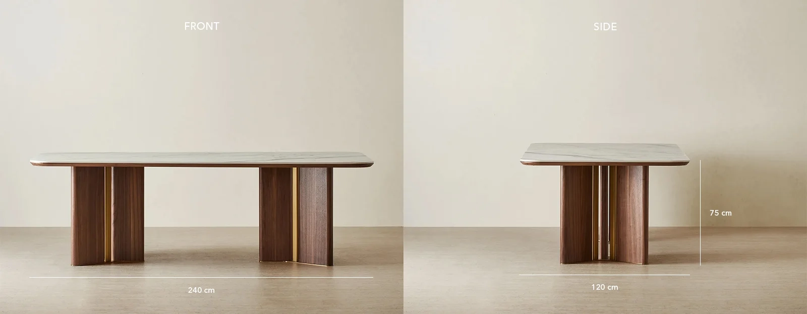 The Sir Lionell Dining Table features an elegant white sintered stone top with subtle veining, supported by walnut brown wooden legs with open spaces for a sophisticated look. It comfortably seats 8 to 10 guests.