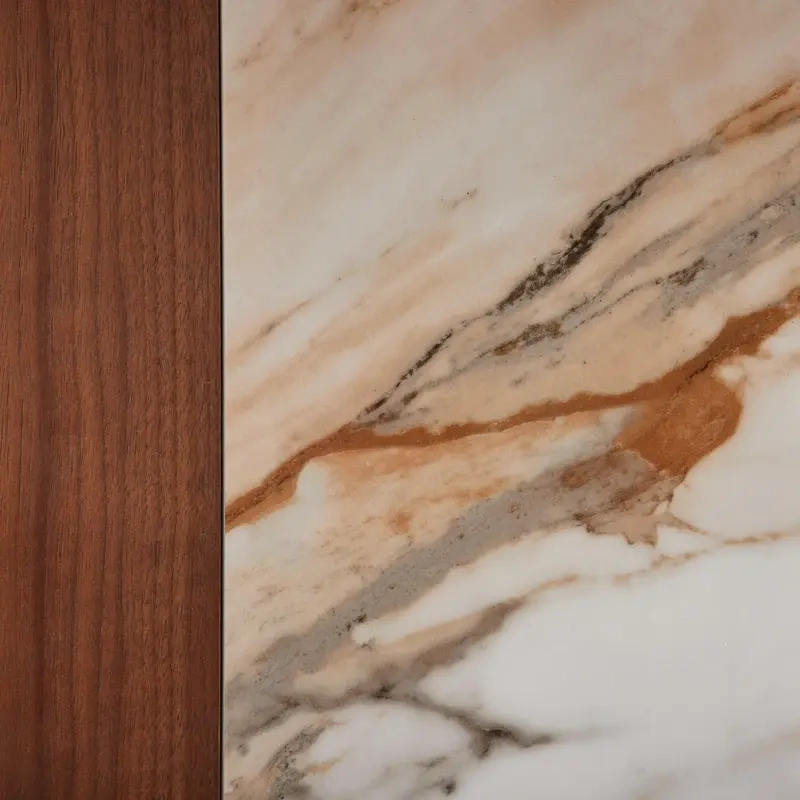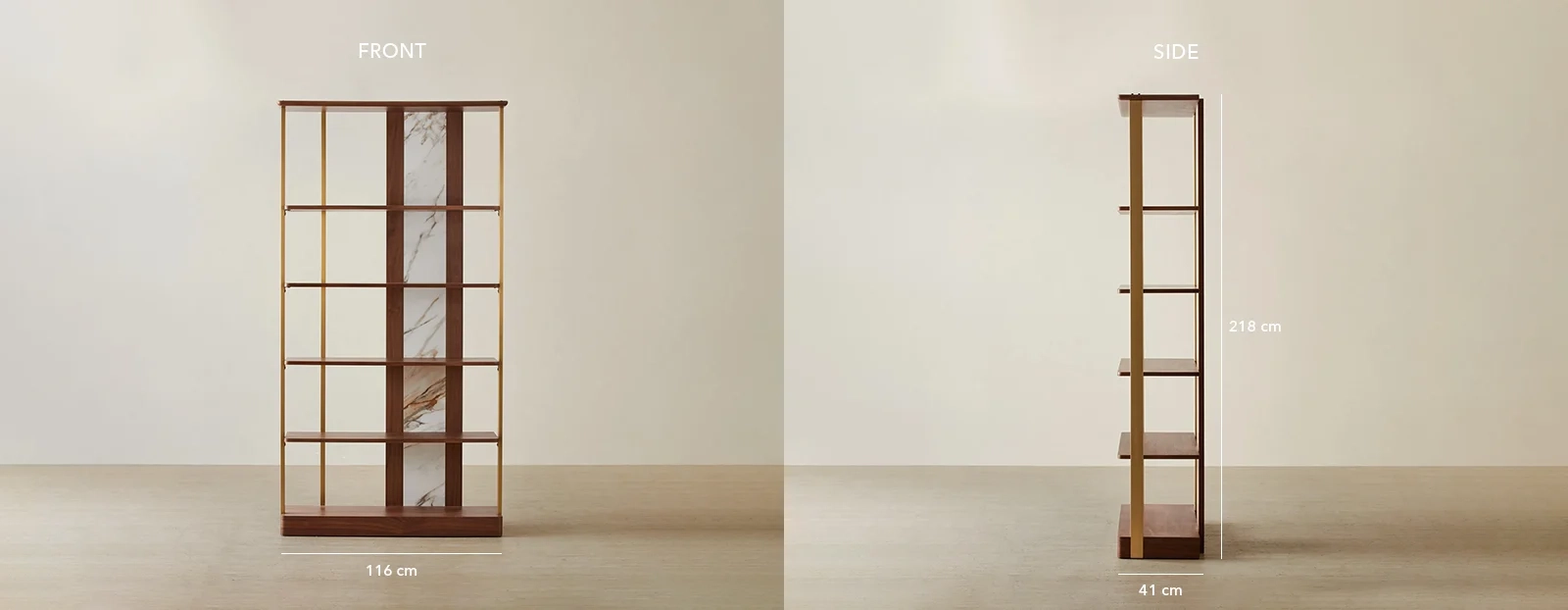 A sintered stone panel adds a touch of luxury, with its marble-inspired surface bringing depth and refinement. More than a shelf, it is a stage for personal stories and timeless treasures.