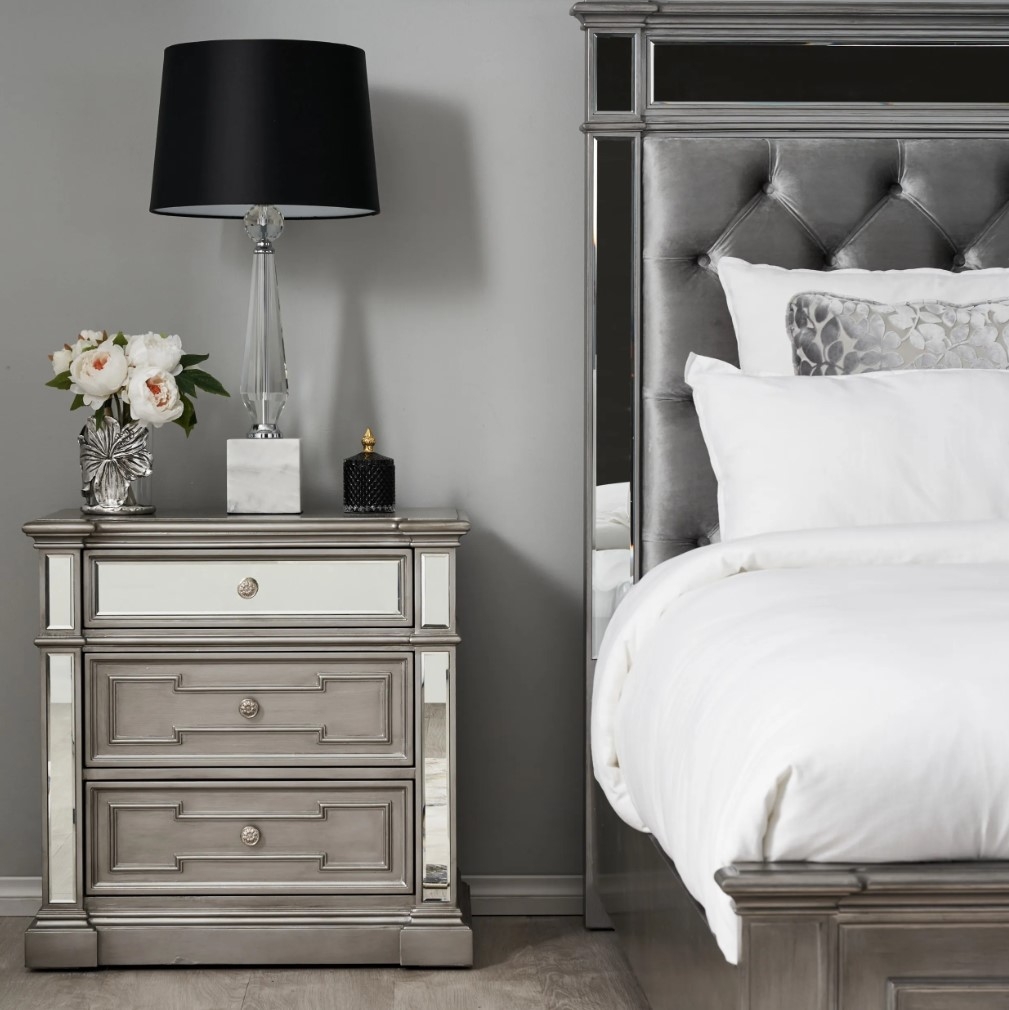 Its allure is further enhanced by the exquisite mirrored panels that adorn each side of the outer frame. These mirrored surfaces reflect light, creating a sense of brightness and adding a touch of grandeur to your space. The Solitude Bedside Table offers practicality and ample storage with three spacious drawers. Each drawer is thoughtfully designed with stylized handles, adding a touch of elegance to the overall aesthetic. Organize your belongings with ease, keeping your bedroom tidy and clutter-free.