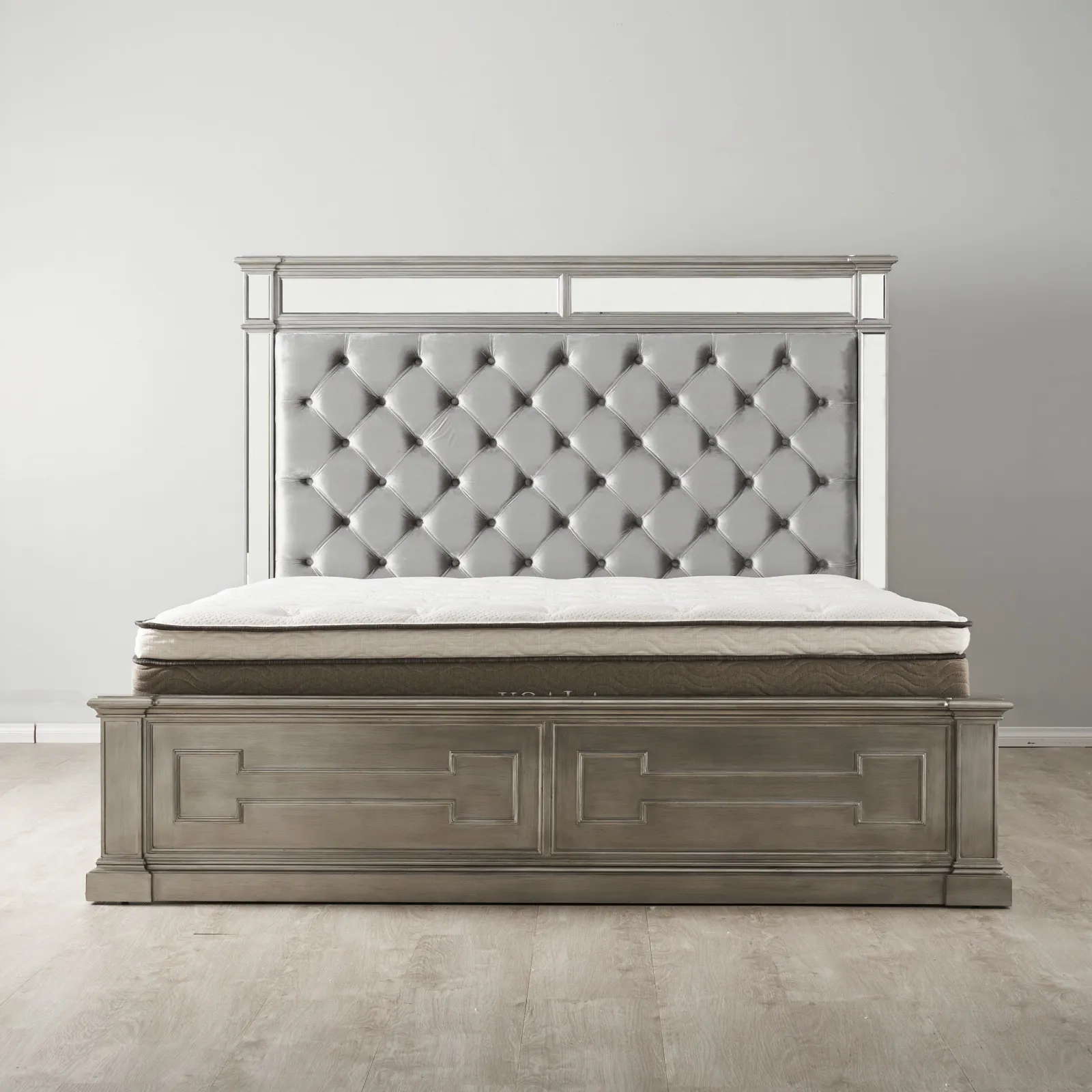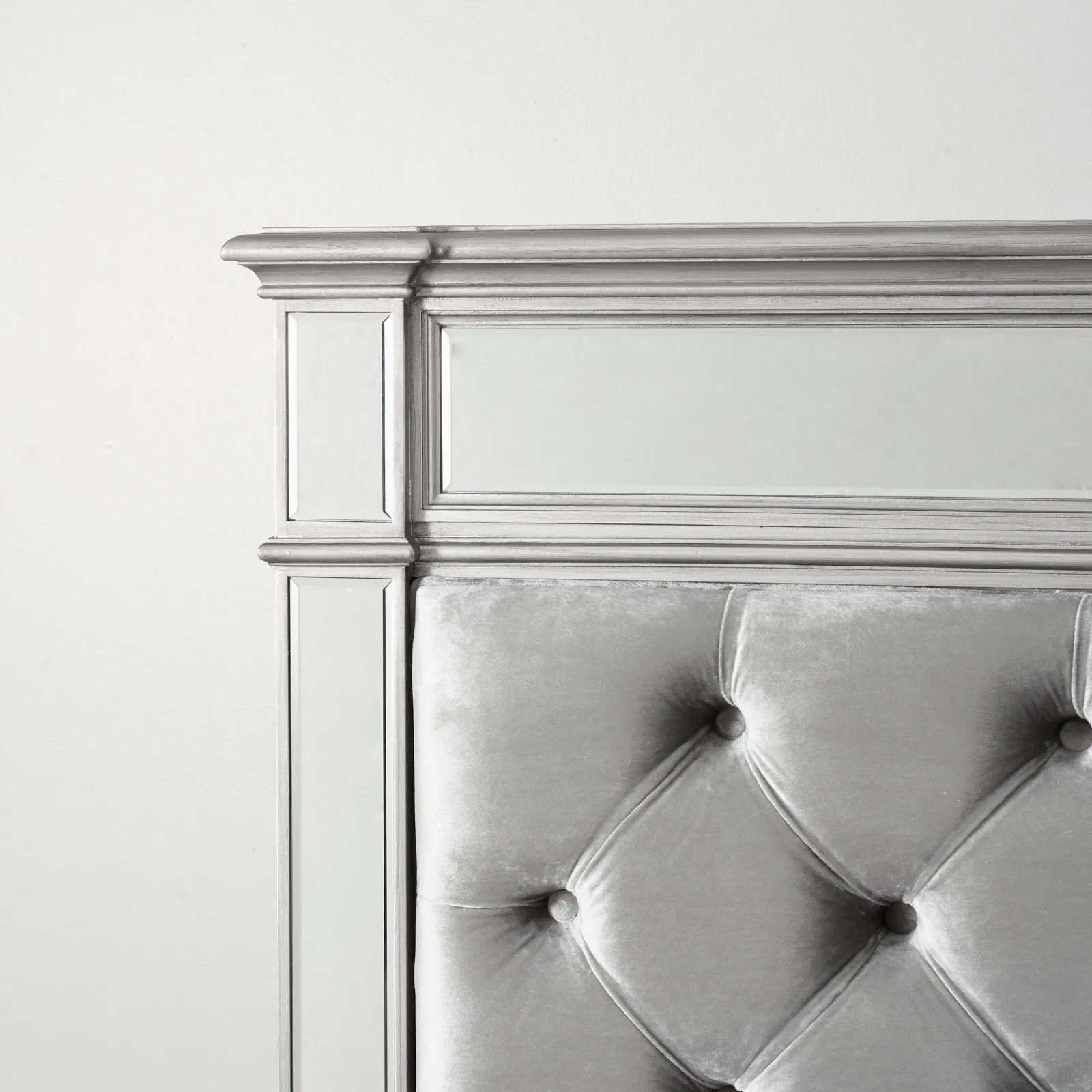 The Solitude Antique Silver King Bed is a timeless piece worthy of your attention. It boasts an Antique Silver coloured Headboard made of sumptuously soft pile velvet with visible tufting that adds charm and luxury to the overall aesthetic. A set of Antique Silver Mirrors encapsulates the gorgeous Headboard to create an extraordinarily eye-catching combination. These mirrors play with the perception of space and add intrigue to the bedroom.