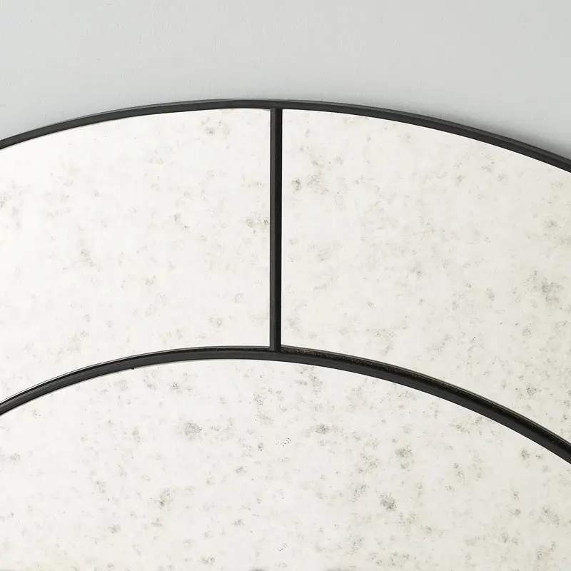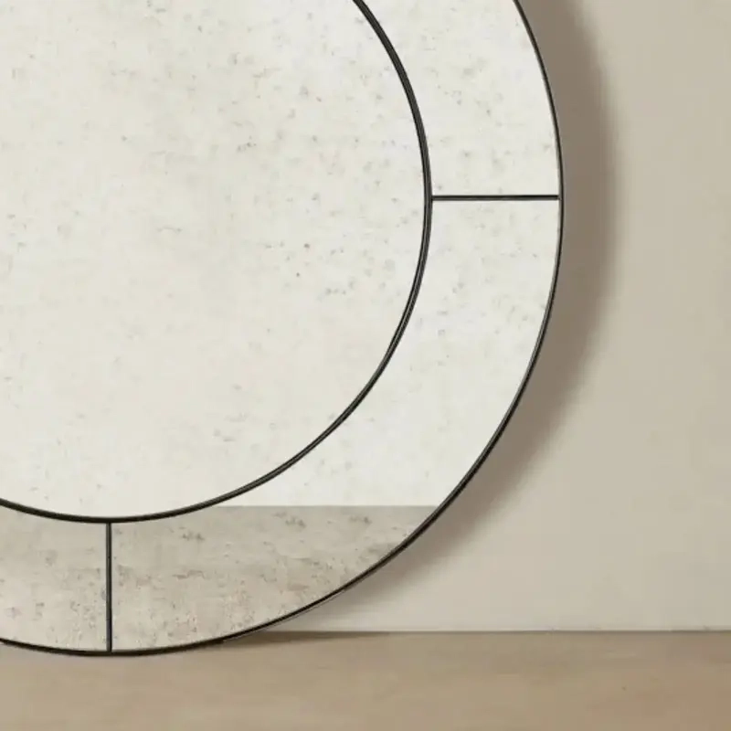 The Solveig II Mirror commands attention with its bold circular form, divided by fine black borders that trace an elegant geometric rhythm.