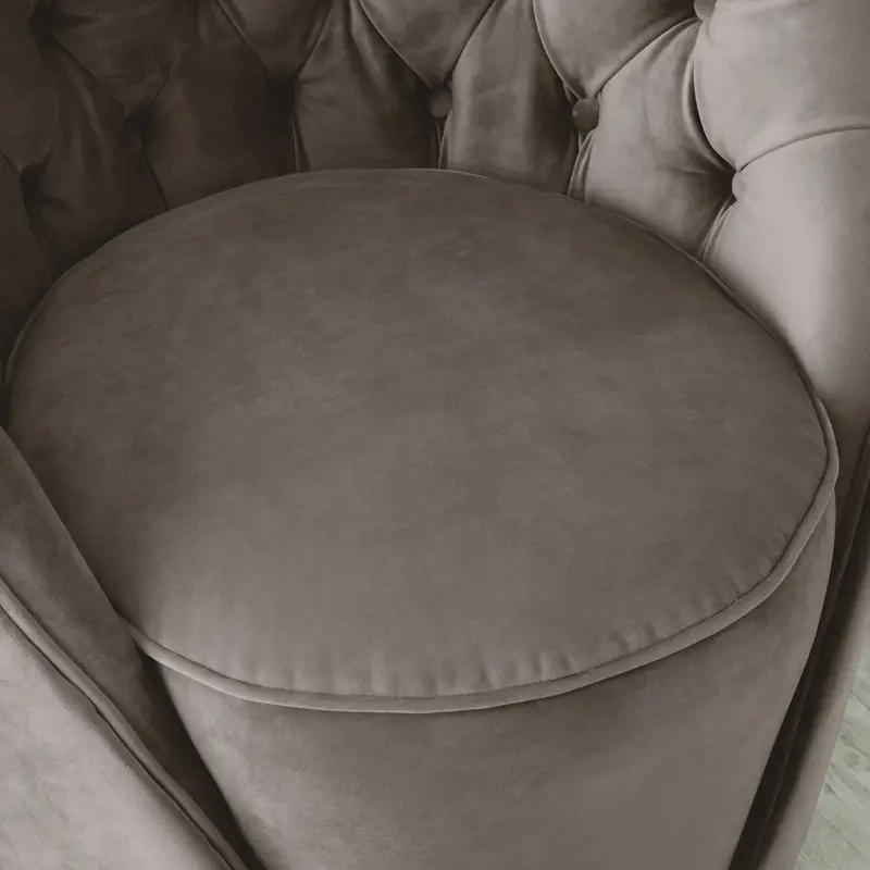 Inspired by the classic Tub chair, the Sonja Mushroom Velvet Swivel Occasional Chair reimagines its essential elements for a luxurious lounging experience. Upholstered in premium mushroom velvet, its elegantly curved frame flows seamlessly, resembling a throne.