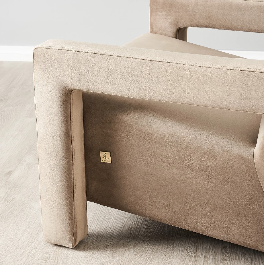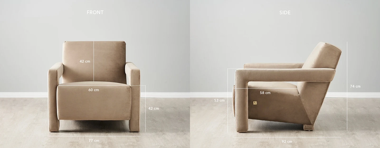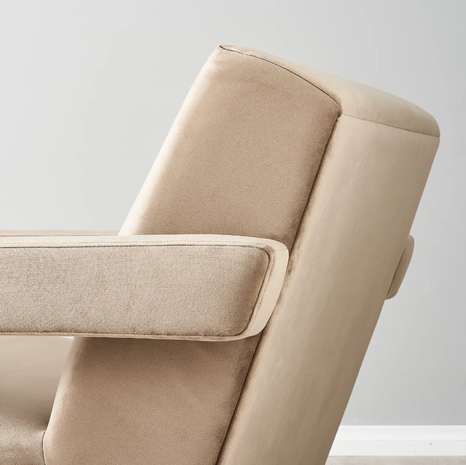 The beige velvet arms of the Stellan Chair catch the light with a subtle sheen, adding to its chic and sophisticated vibe. Its versatile colour works as a neutral base or a statement piece, blending with muted tones or contrasting vibrant decor.