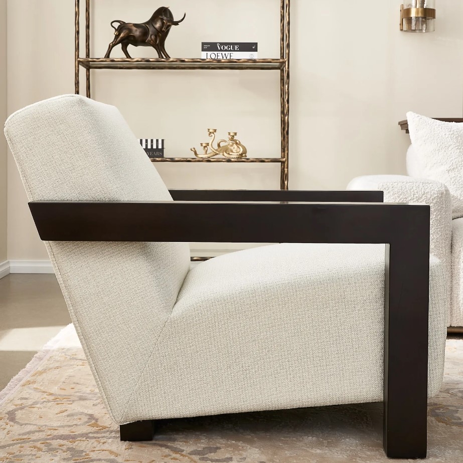 It features sophisticated chestnut white woven fabric upholstery paired with sleek Espresso Brown Wooden Legs, adding a contemporary touch. The luxurious combination of fabric and wood creates a stylish and modern aesthetic, enhancing any space.