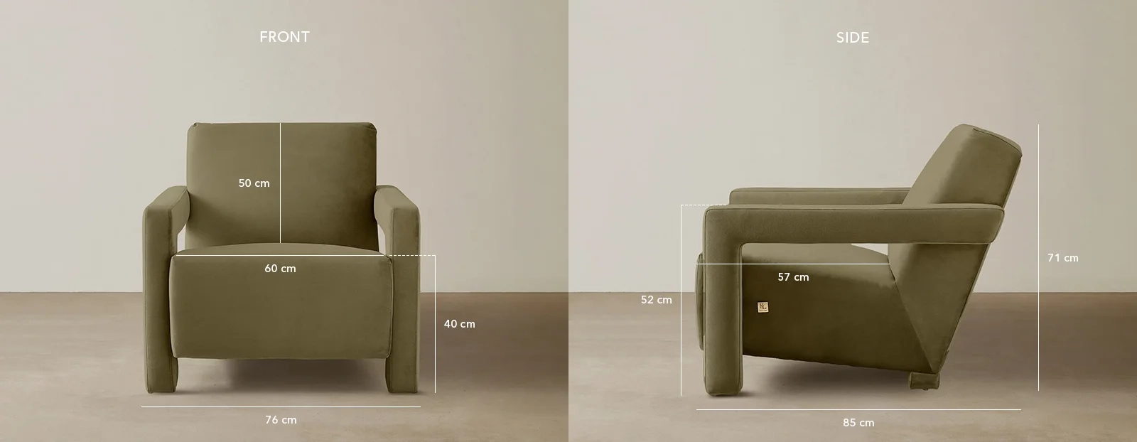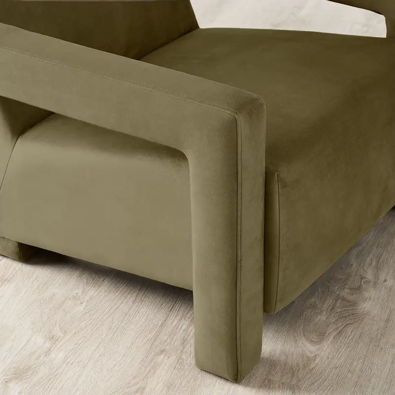 The olive green velvet arms of the Stellan Chair catch the light with a subtle sheen, enhancing its chic and sophisticated vibe. Its versatile colour works as a neutral base or a statement piece, complementing muted tones or contrasting with vibrant decor.