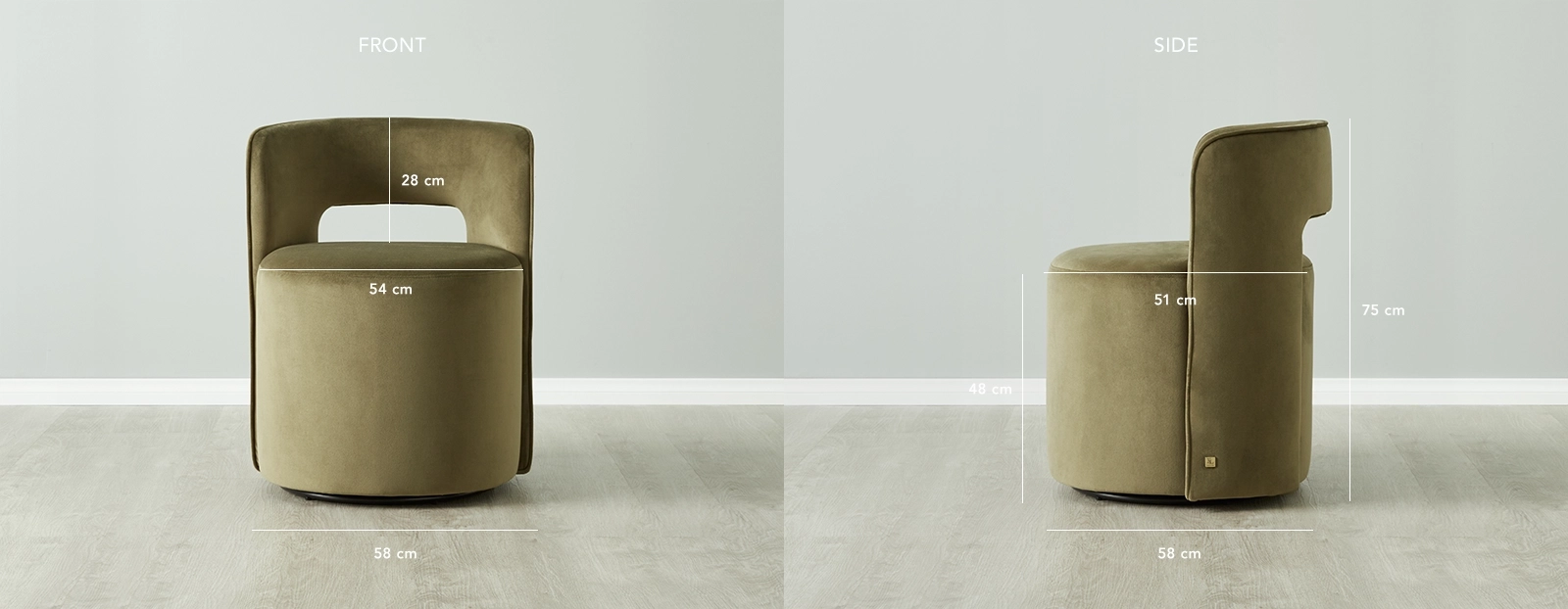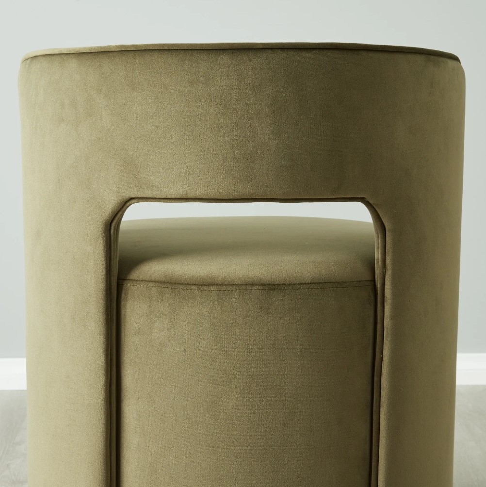The Sutton embraces you in its entirety, as every inch of its frame is upholstered in soft and opulent velvet fabric. The rich Olive Green shade adds a touch of elegance and warmth, creating a captivating visual presence. Its slim lines and open-lower back design not only showcase a modern aesthetic but also offer a sense of lightness to its design. This unique feature enhances the chair's contemporary allure, making it a perfect addition to any stylish dining space.