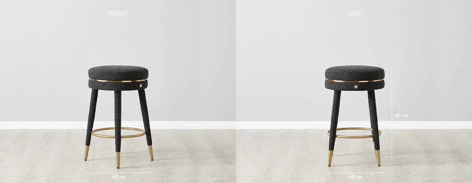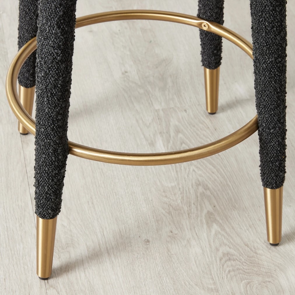 Add a luxurious seat to your dining areas with the Sylvie Black Boucle Counter Stool. This majestic seat is a true art-deco-inspired delight as it impresses in black and gold. Sit comfortably on its plush and inviting seat, upholstered in inviting high-quality fabric. A dream-like offering of black Boucle covers the seat with its comfortable softness.