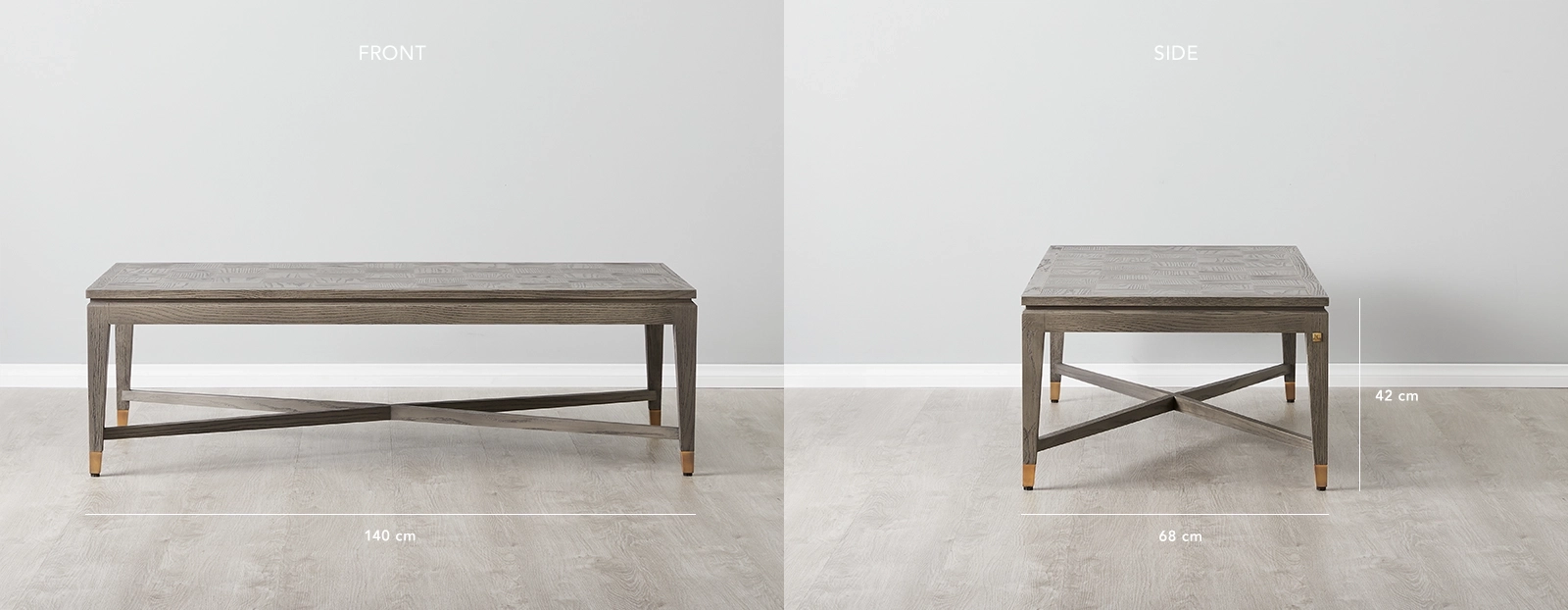 The Tanya Taupe Wooden Coffee Table combines modern rustic style with classic design, featuring a high-quality oak and veneer frame. Its checkered veneer tabletop and golden-coloured border add unique detail and elegance to any living room.