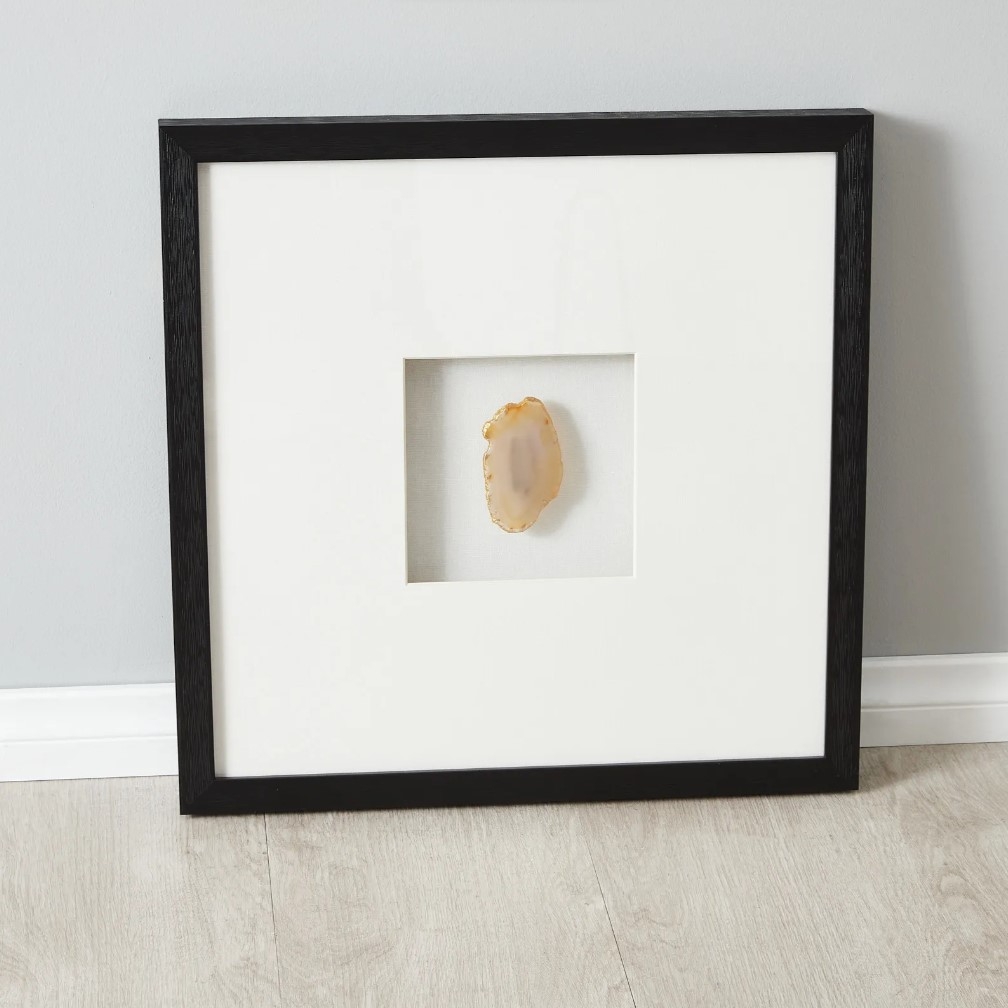 The Terra Brown Agate Shadow Box with Black Frame is a refined blend of modern design and natural luxury. Encased within a sleek black frame is a single piece of agate, exhibiting a light brown and almost golden coloured hue.