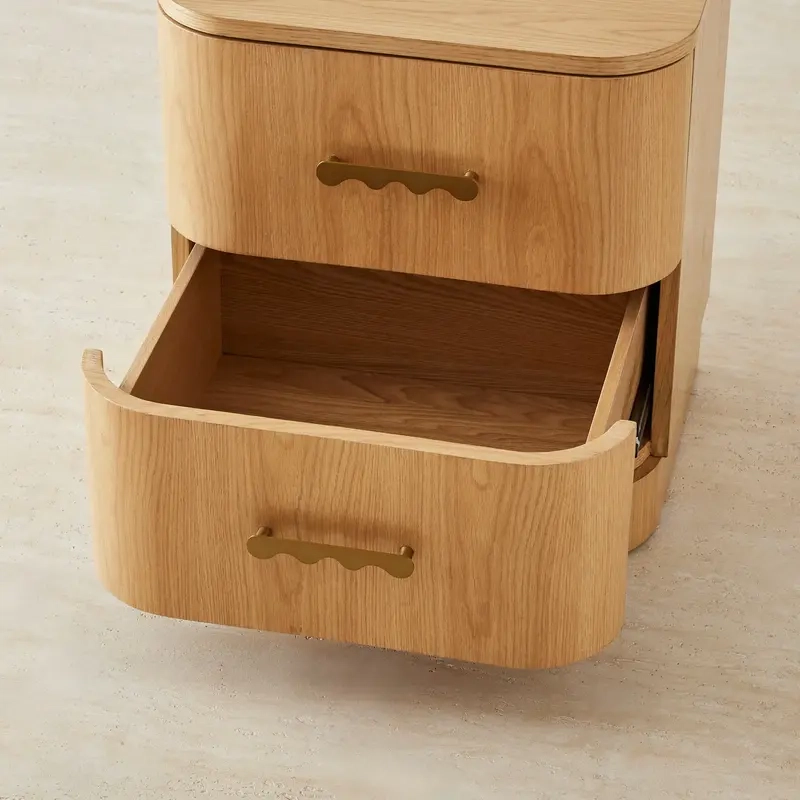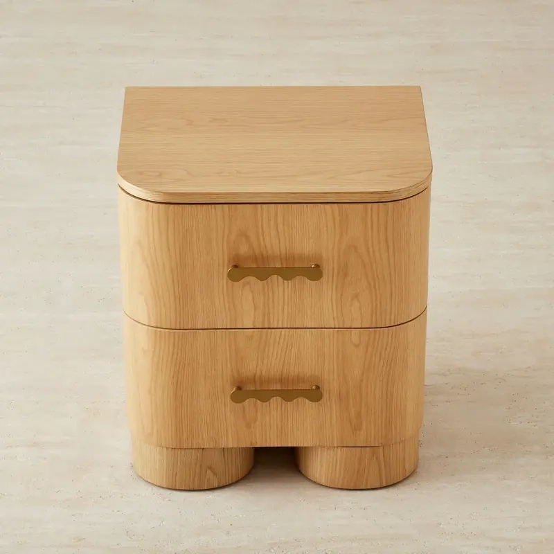 Two curved drawers open with a gentle pull, ready to hide away secret treasures, storybooks, or socks that never seem to stay paired. With playful feet and soft edges, it’s thoughtfully designed for little hands and cozy spaces.