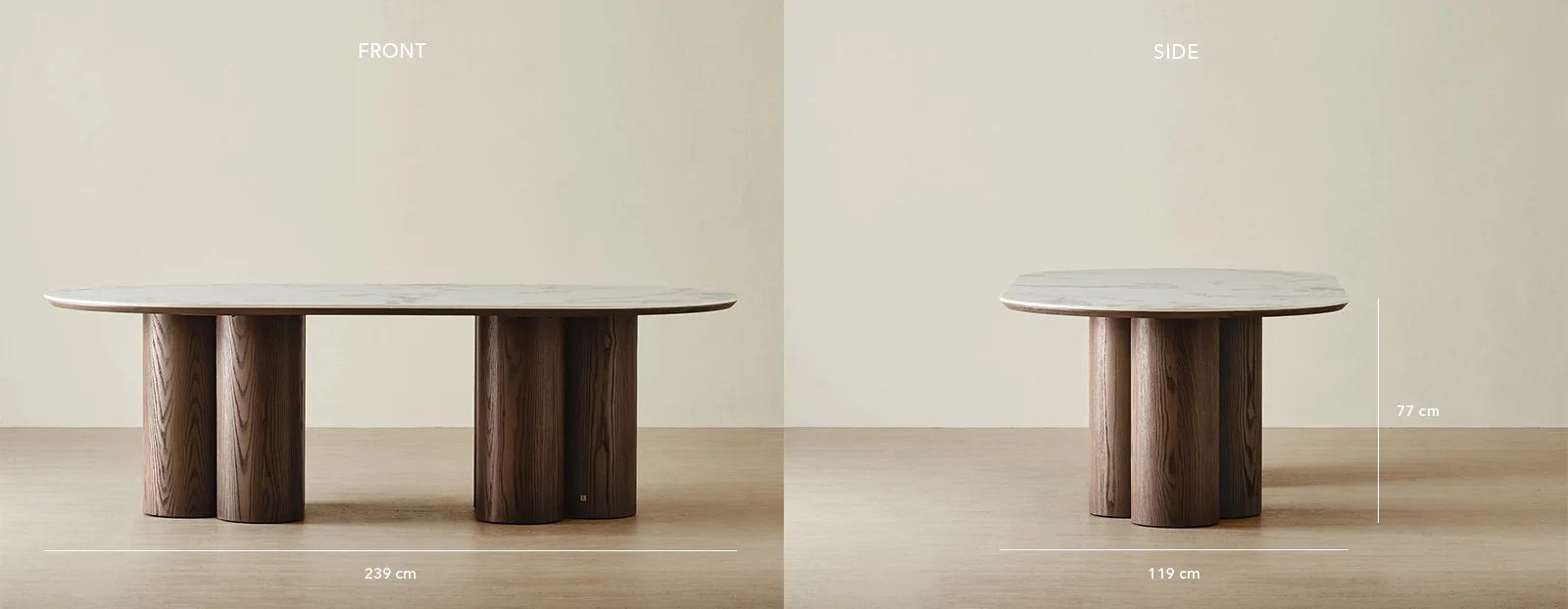 The Terzetto collection embodies a bold yet understated design ethos, seamlessly fitting into the realm of modern contemporary furniture. It merges natural and artificial design elements, intertwining a solid wooden frame with the man-made marble-effect of sintered stone. The collection aims to infuse a sense of tranquility and groundedness through its incorporation of natural motifs. Earthy tones, graceful curves, and textured wooden accents define its natural aesthetic. To exude that sense of luxury that Koala Living is known for, we've chosen a Pandora Brown sintered stone top, characterised by a marbled fusion of rusted brown and grey hues. It comprises a dining table, coffee table, and console table. We aspire for this collection to invigorate your living space with renewed vitality, enduring through many years to come.